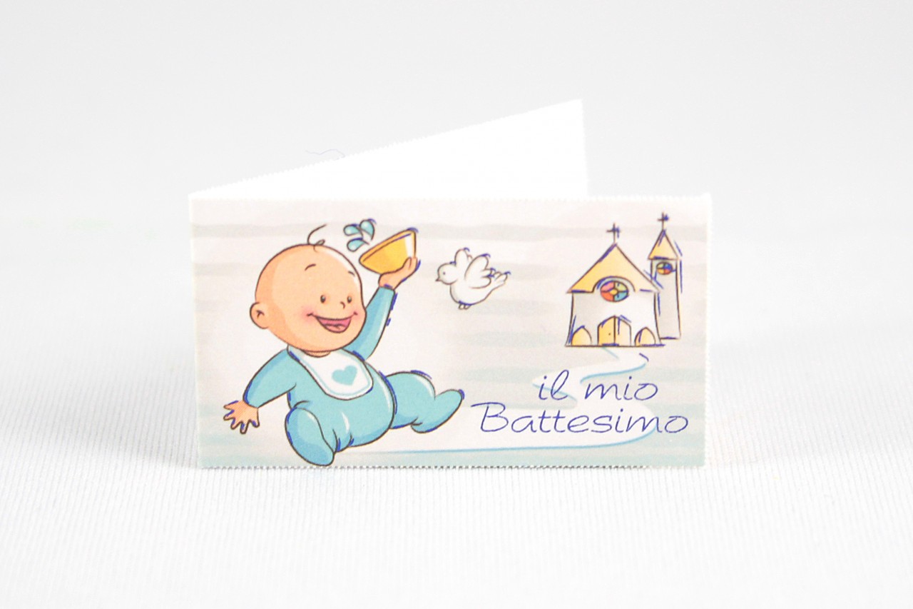 Formato aperto: cm 9 x 2,5. Formato chiuso: cm 4,5x 2,5. Stampa tipografica e lamina a caldo. Prezzo indicato per 100 pezzi.