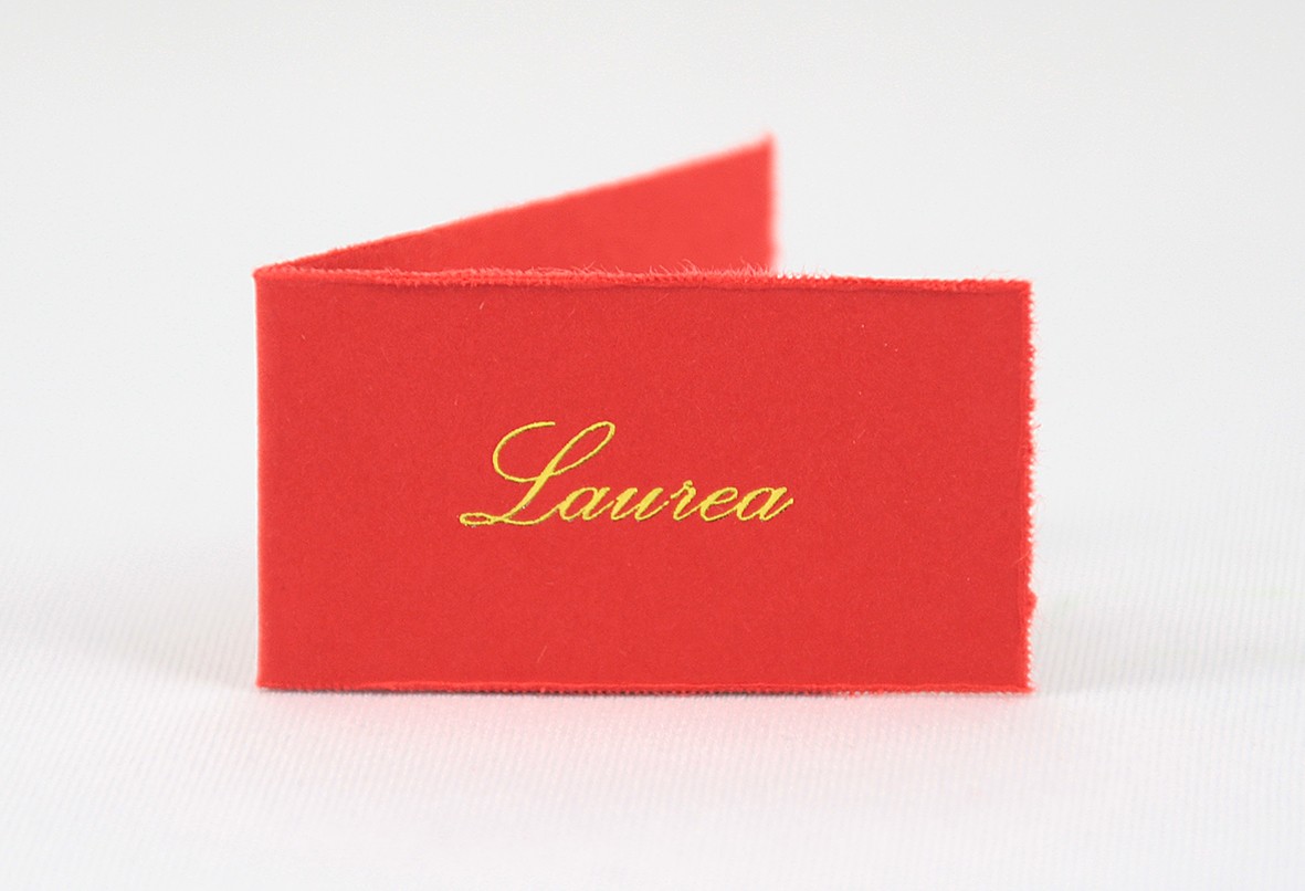 Formato aperto: cm 9 x 2,5. Formato chiuso: cm 4,5x 2,5. Stampa tipografica e lamina a caldo. Prezzo indicato per 100 pezzi.