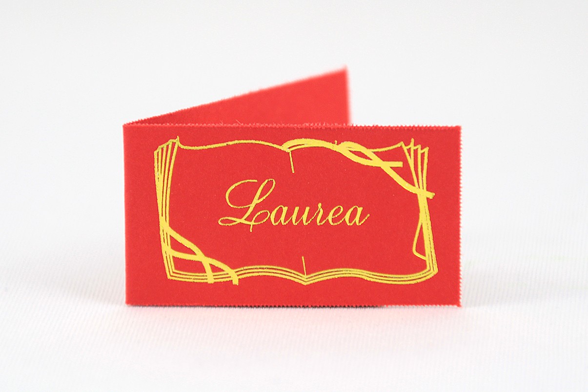 Formato aperto: cm 9 x 2,5. Formato chiuso: cm 4,5x 2,5. Stampa tipografica e lamina a caldo. Prezzo indicato per 100 pezzi.