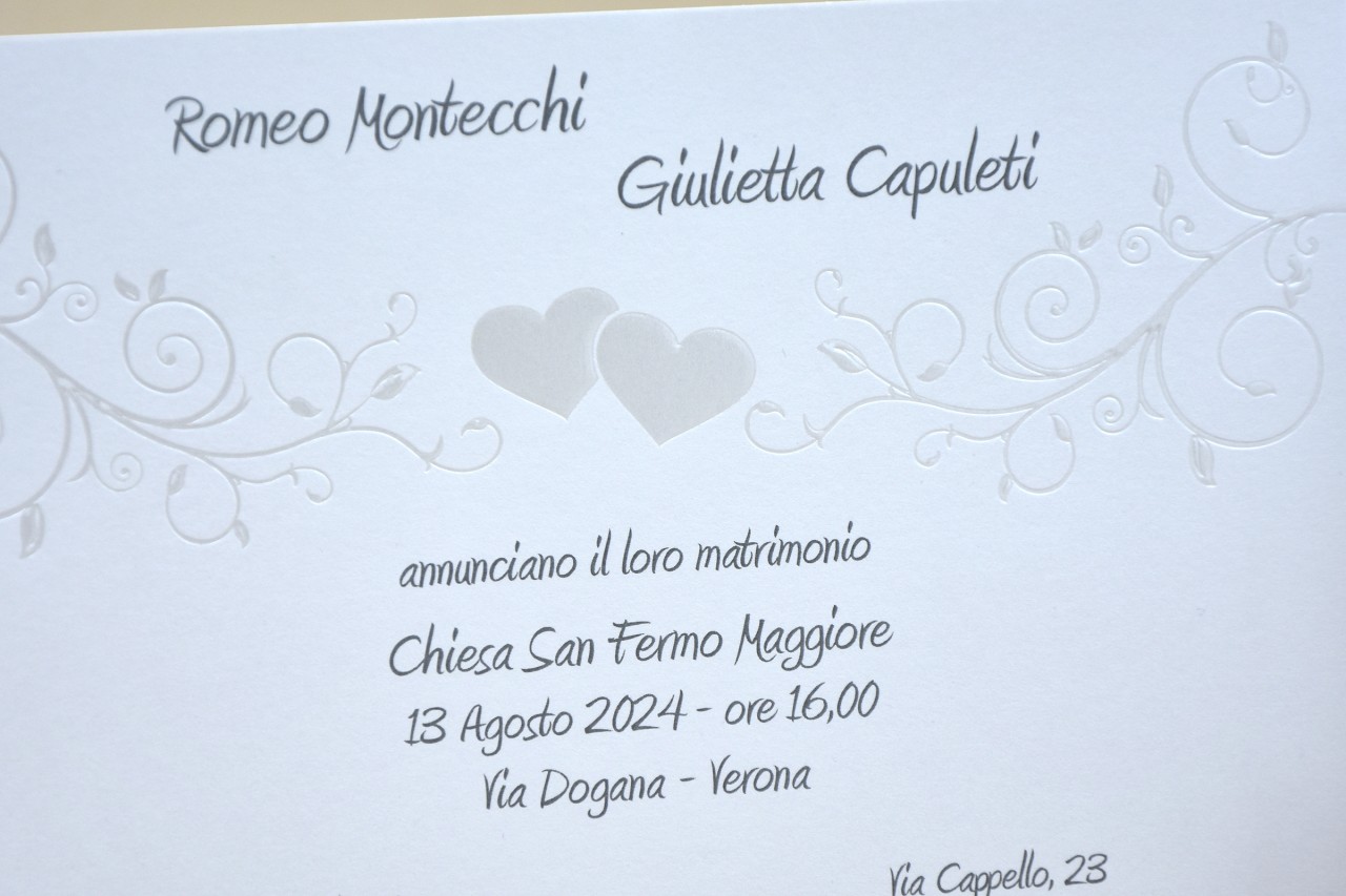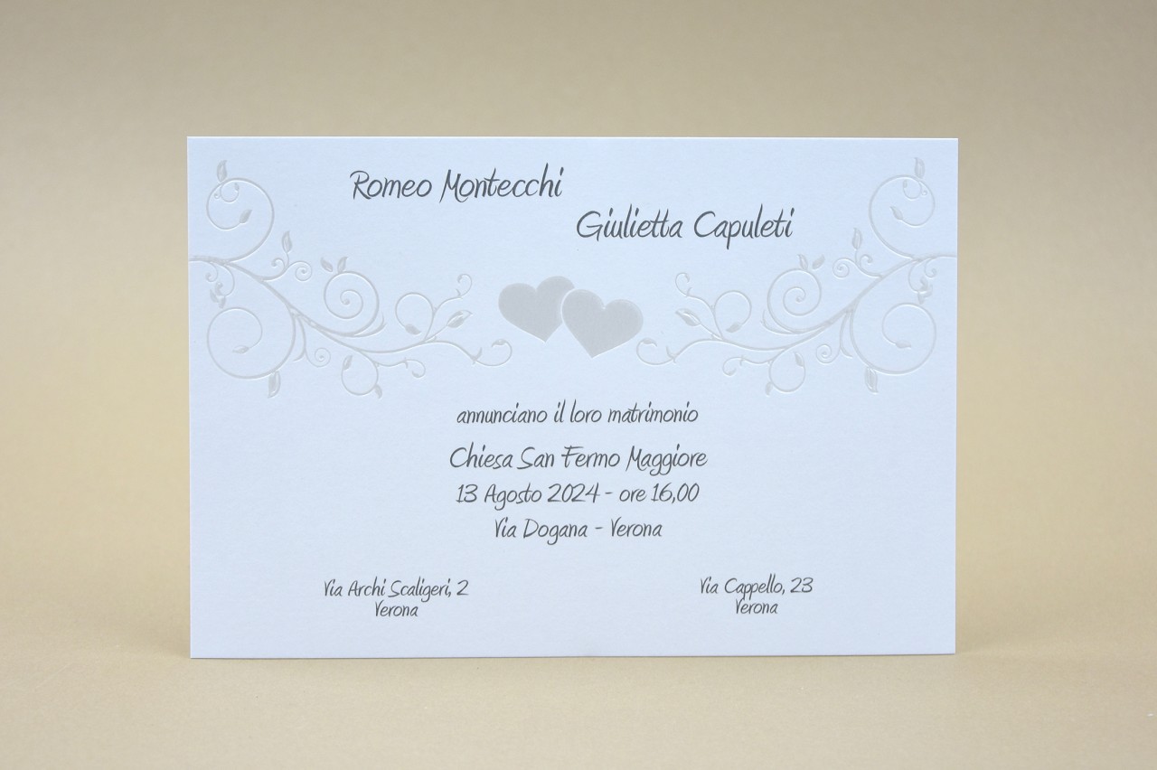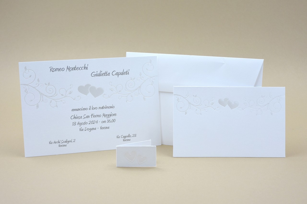 - Carta Bianca 240 gr /mq - Decori in lamina perlata e rilievo - Busta, invito e biglietto bomboniera inclusi nel prezzo