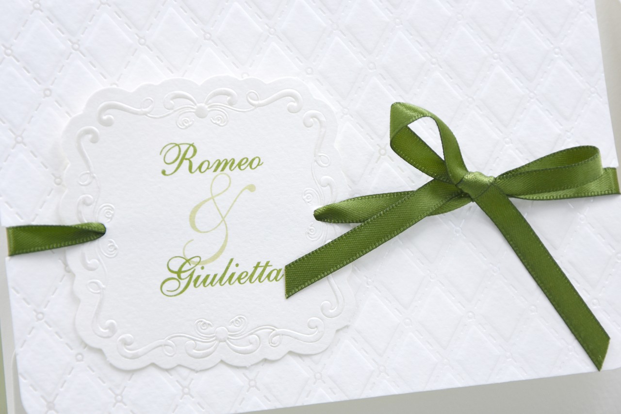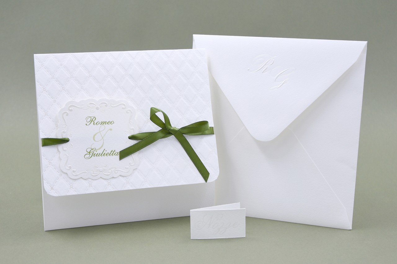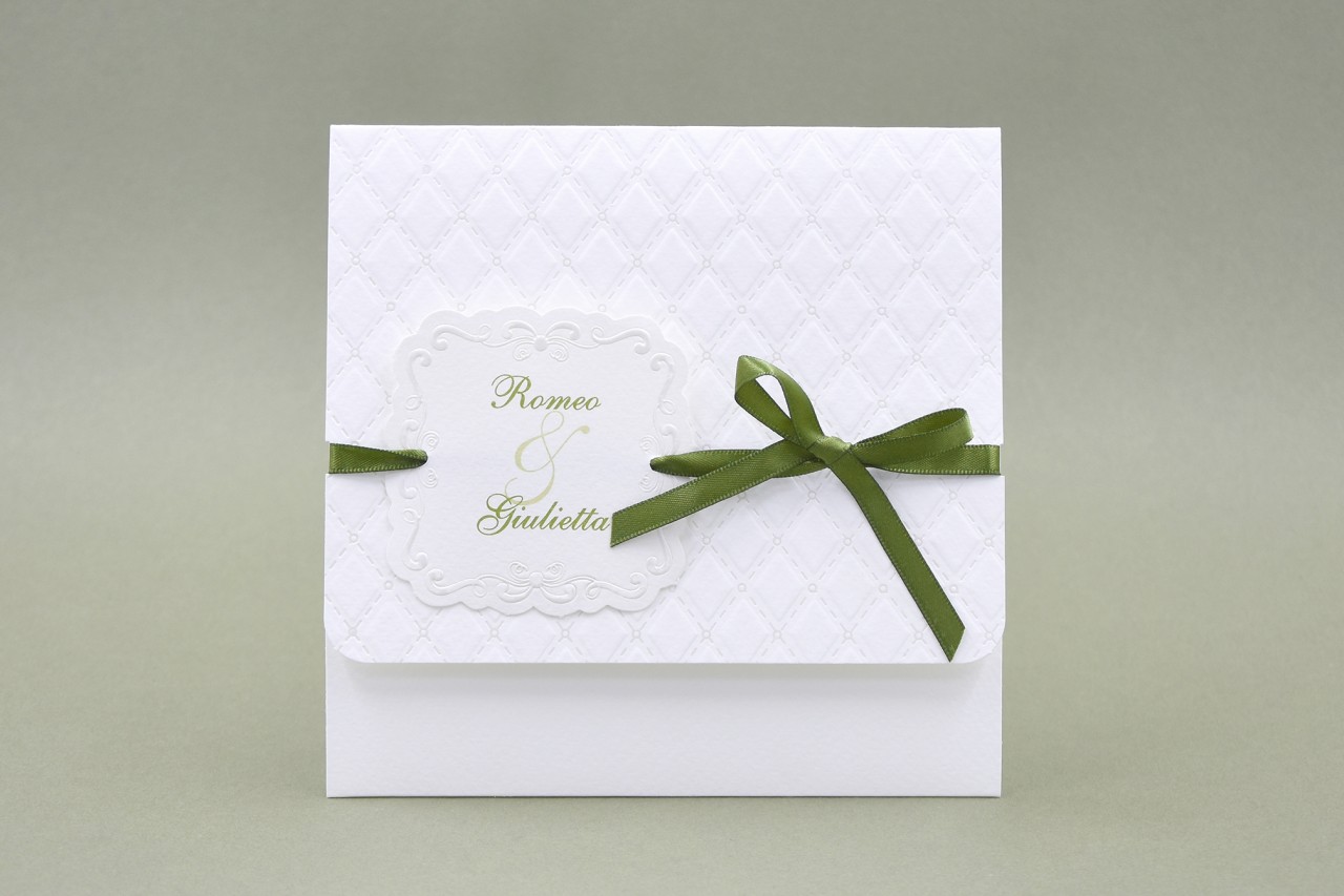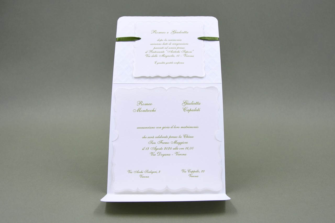- Formato aperto: 350x150 mm- Formato chiuso: 150x150 mm- Carta Bianca 240 gr /mq (Esterno)- Carta Bianca 170 gr /mq (Interno)- Lamina a caldo perlata e rilievo- Natro in doppio raso per fissaggio tag- Busta, invito e biglietto bomboniera inclusi nel prezzo