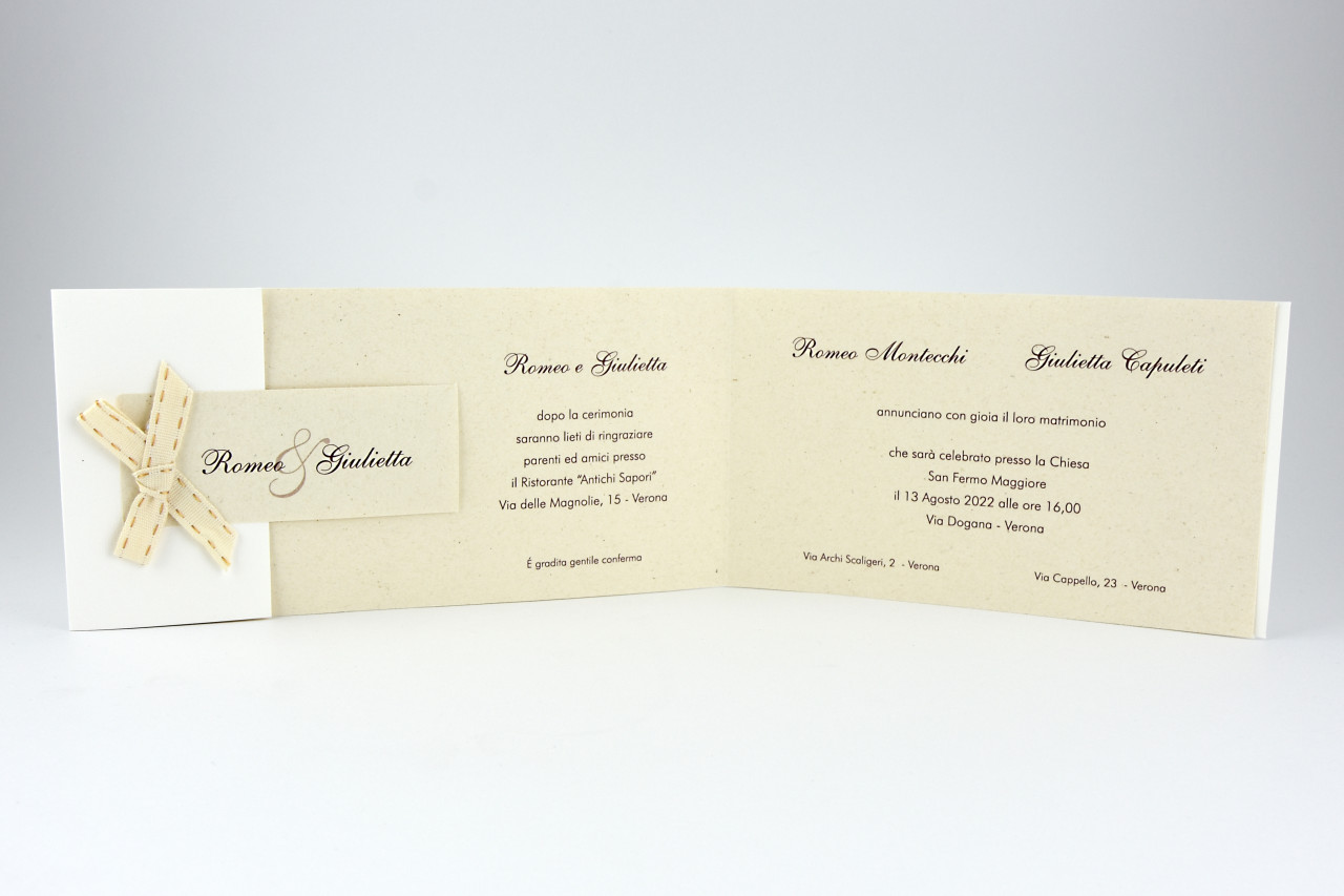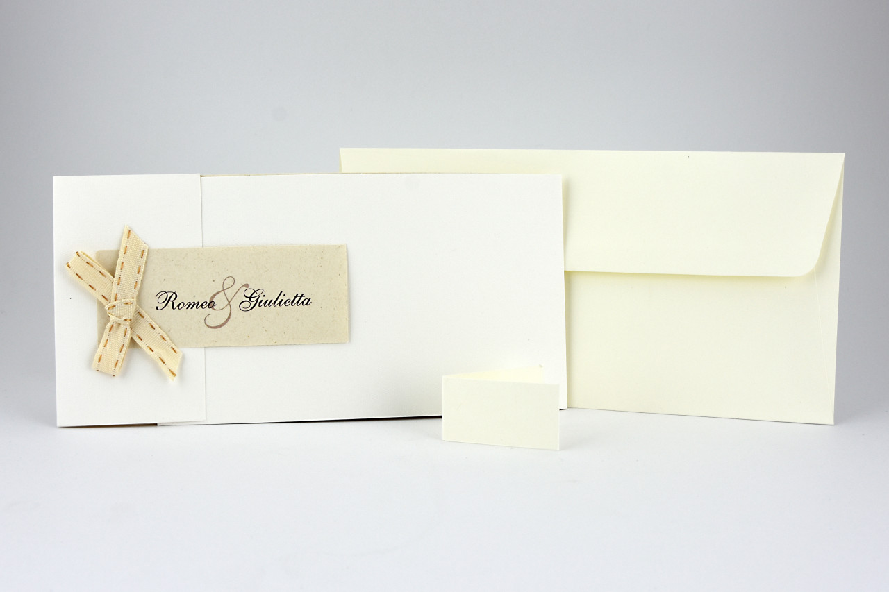 - Formato aperto: 420x100 mm- Formato chiuso: 210x100 mm- Carta Bianca 240 gr /mq (Esterno)- Carta Riciclata Beidge 170 gr /mq (Interno)- Nastro in cotone- Busta, invito e biglietto bomboniera inclusi nel prezzo
