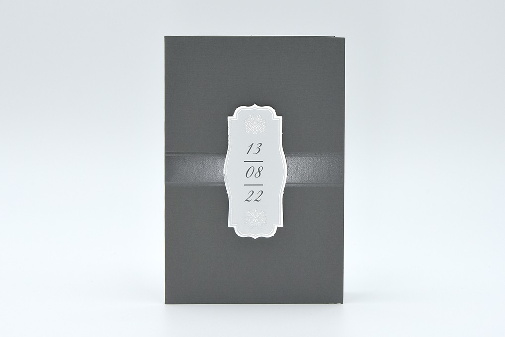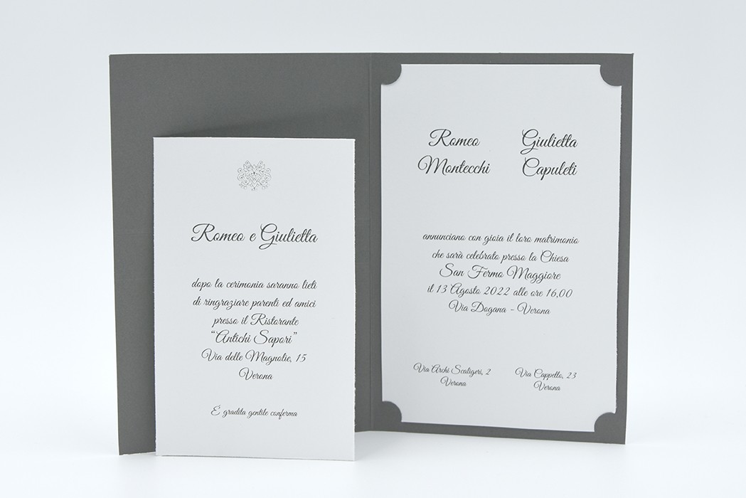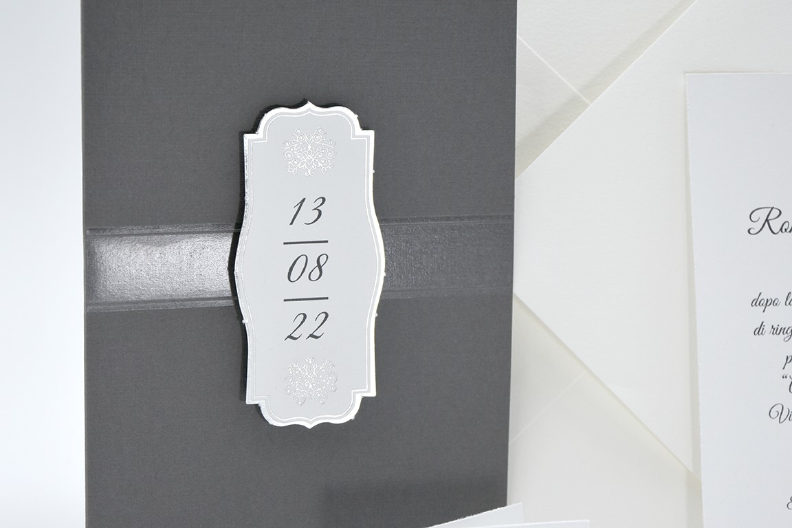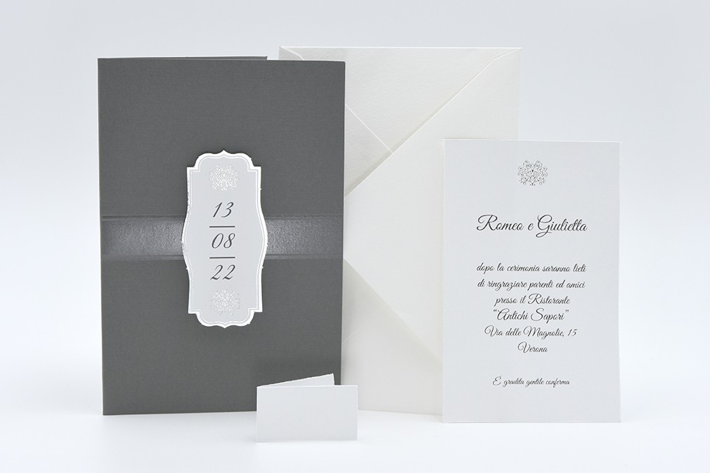 Formato aperto: 170 x 230 mm- Formato chiuso: 115 x 170 mm - Carta bianca 200 gr /mq (interno) - Carta grigia 240gr /mq (esterno) - Lamina a caldo trasparente - Busta, invito e biglietto bomboniera inclusi nel prezzo.