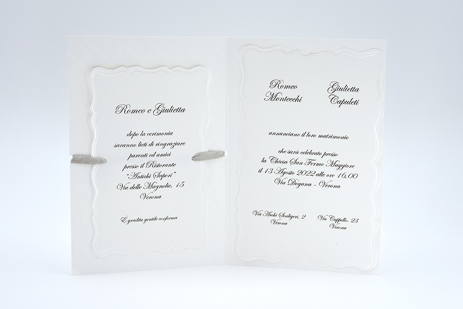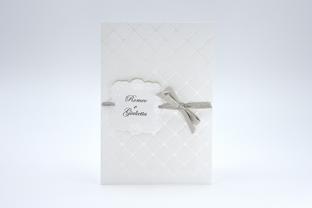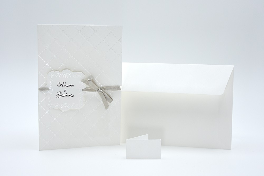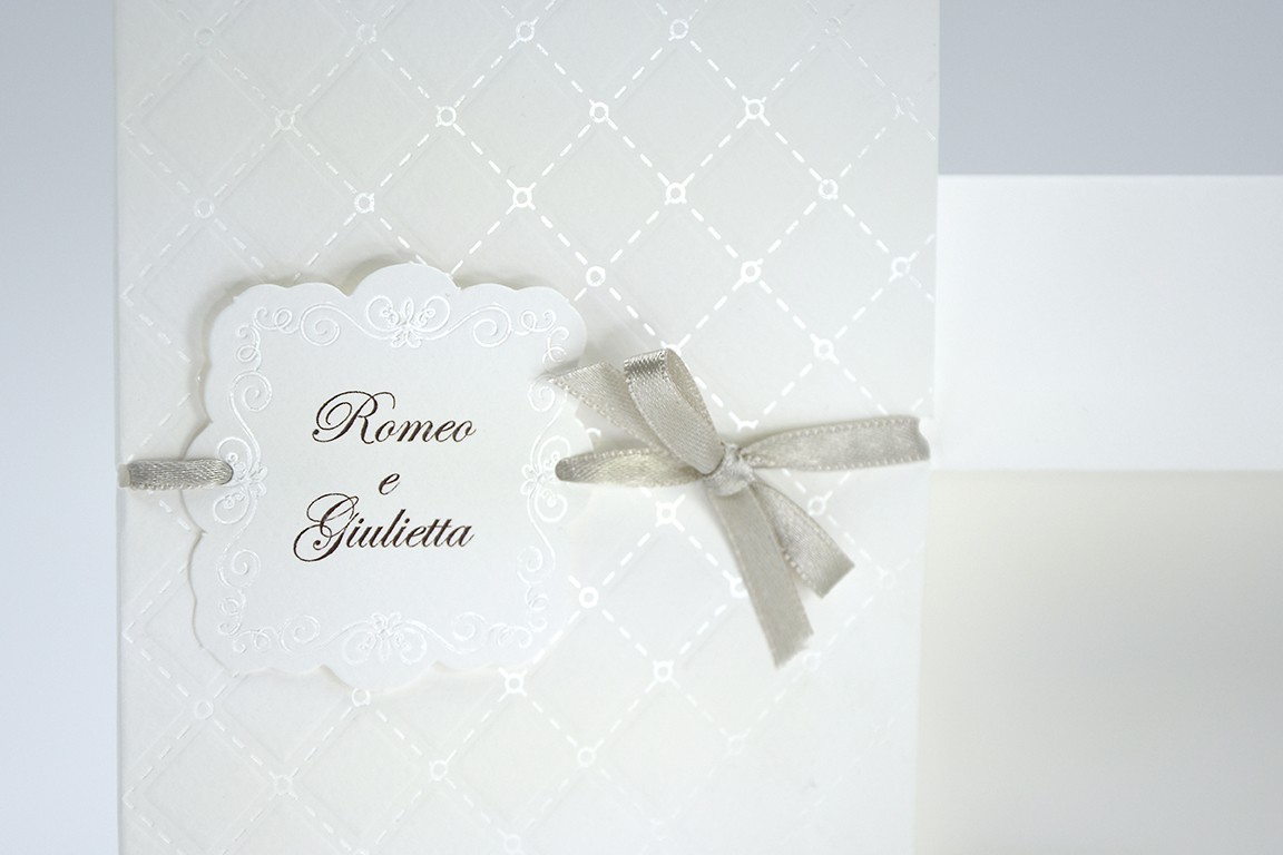 Formato aperto: 170 x 230 mm - Formato chiuso: 170 x 115 mm - Carta bianca 200 gr /mq (interno) - Carta bianca 240 gr /mq (esterno) - Lamina a caldo perlata e rilievo a secco - Nastro doppio raso - Busta e biglietto bomboniera inclusi nel prezzo.
