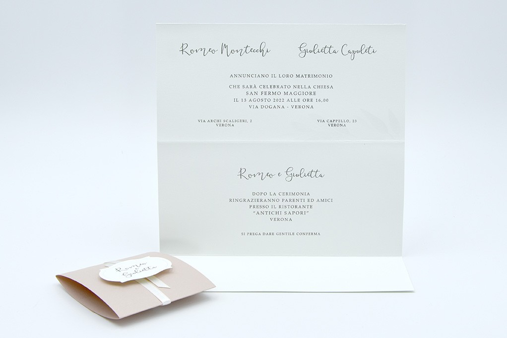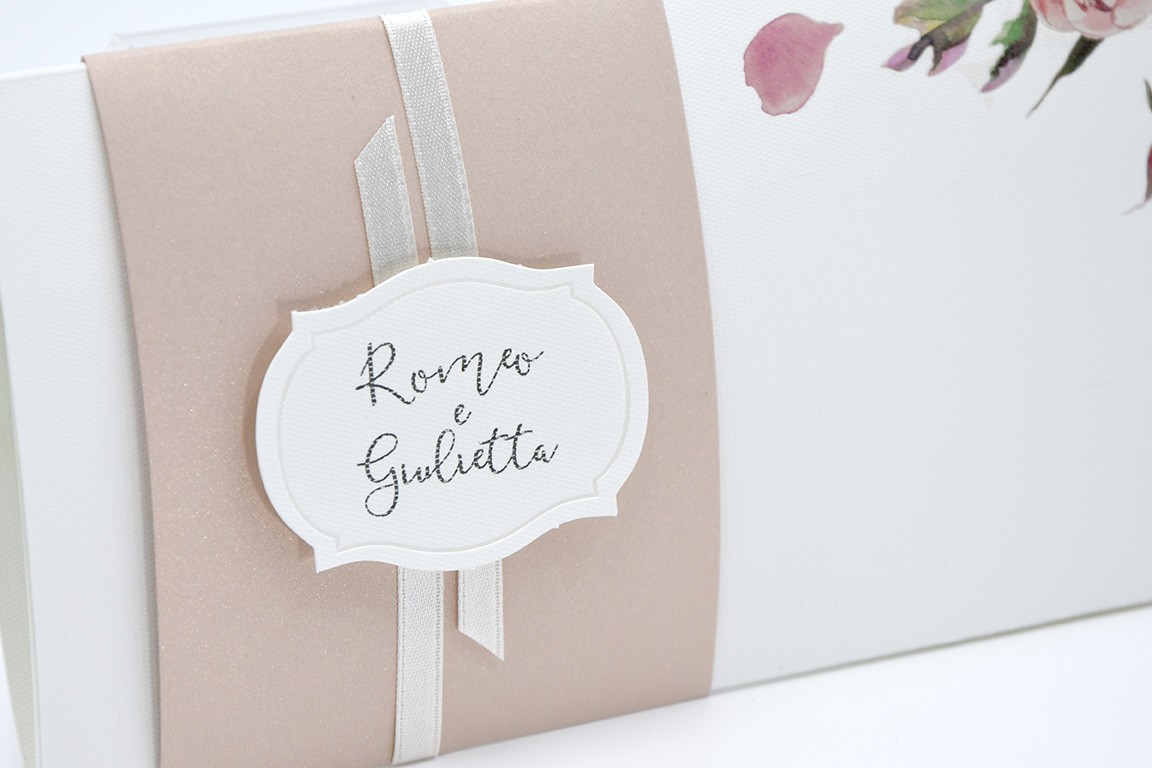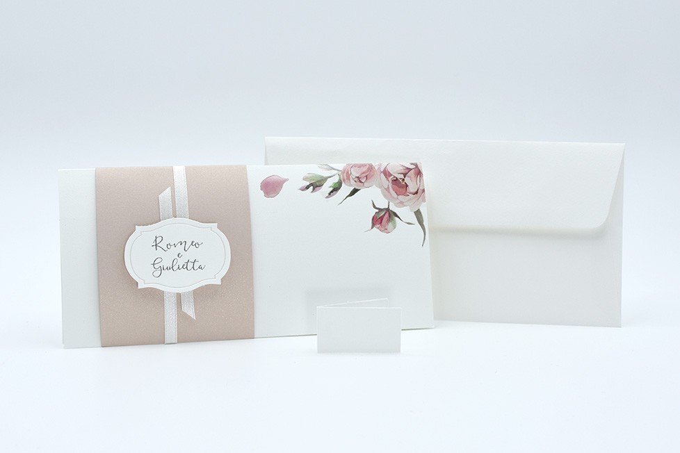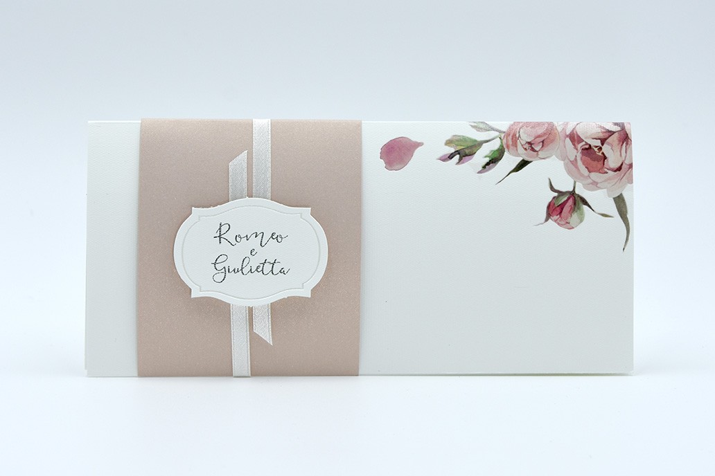 Formato aperto: 300 x 100 mm - Formato chiuso: 210 x 100 mm - Carta rosa antico 170 gr /mq (fascetta) - Carta bianca 3250 gr /mq (esterno) - Lamina a caldo trasparente lucido - Nastro doppio raso mm 6 - Busta, nastro e biglietto bomboniera inclusi nel prezzo.
