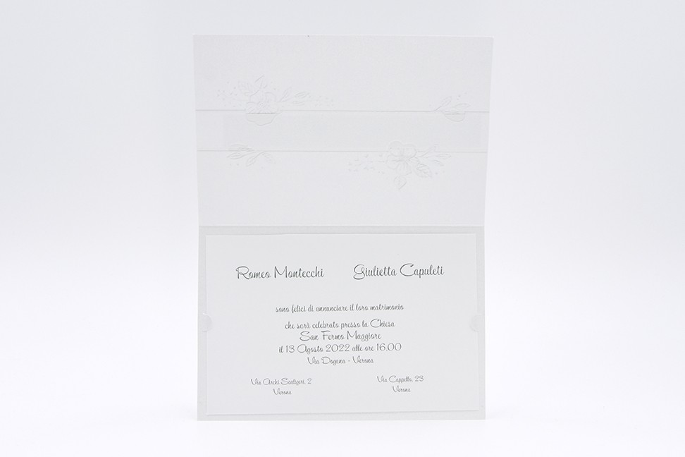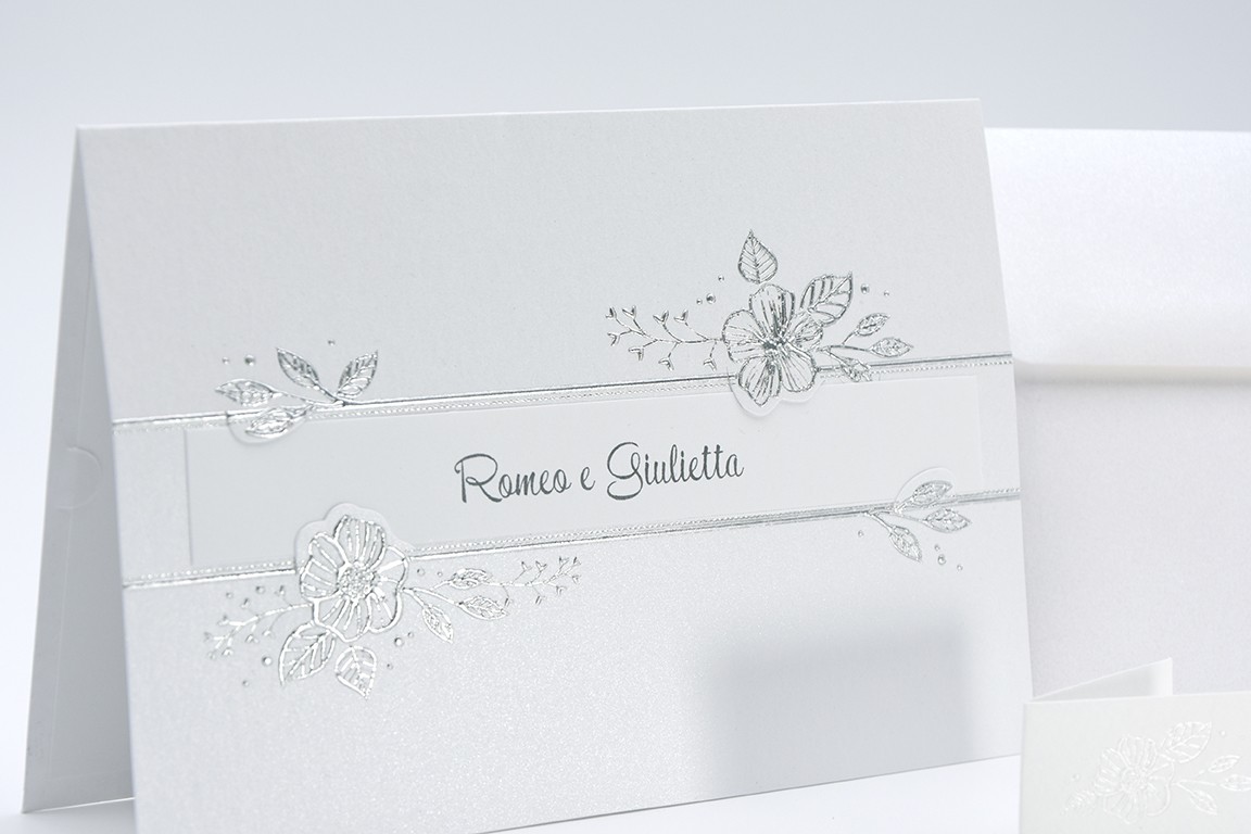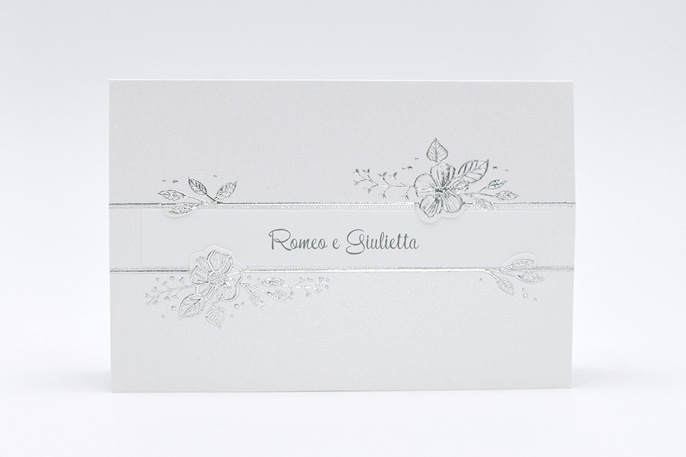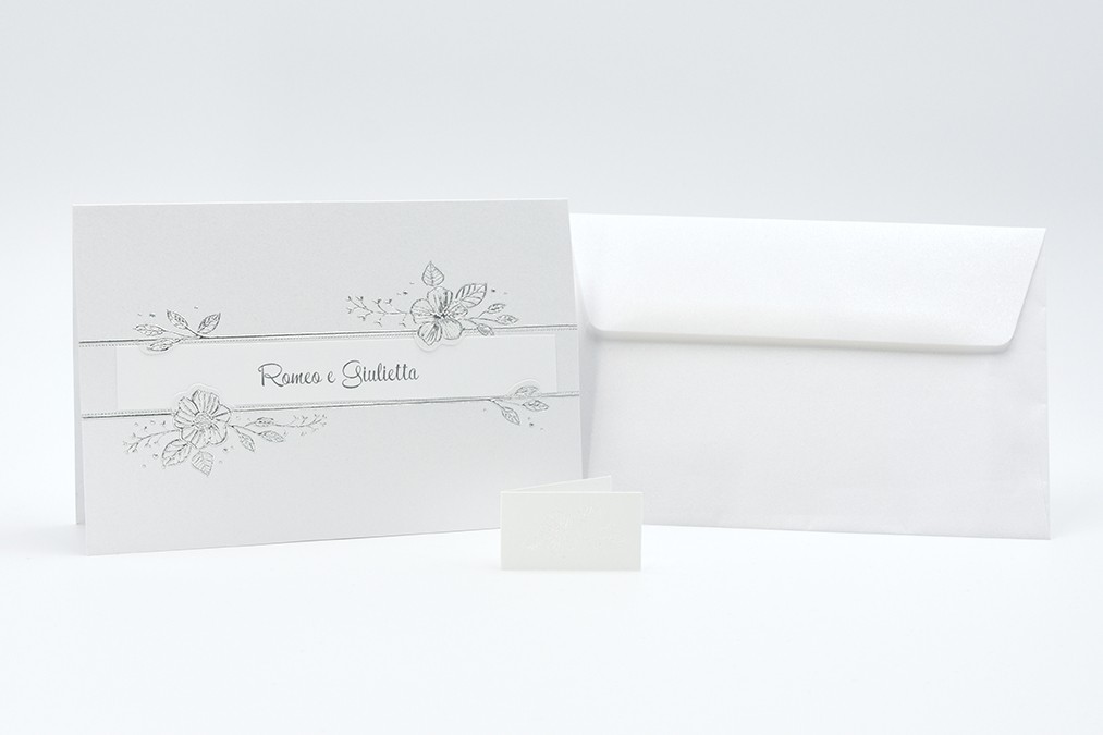 Formato aperto: 230 x 170 mm- Formato chiuso: 170 x 115 mm- Carta bianca 200 gr /mq (interno) - Carta bianca perlata 240 gr /mq (esterno) - Lamina a caldo argento - Busta e biglietto bomboniera inclusi nel prezzo.