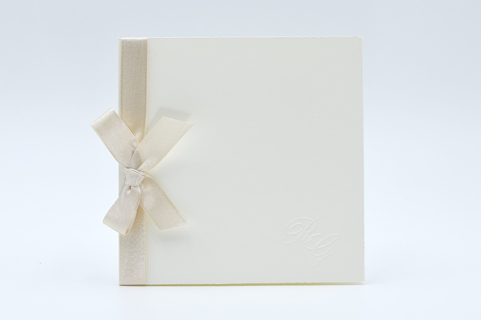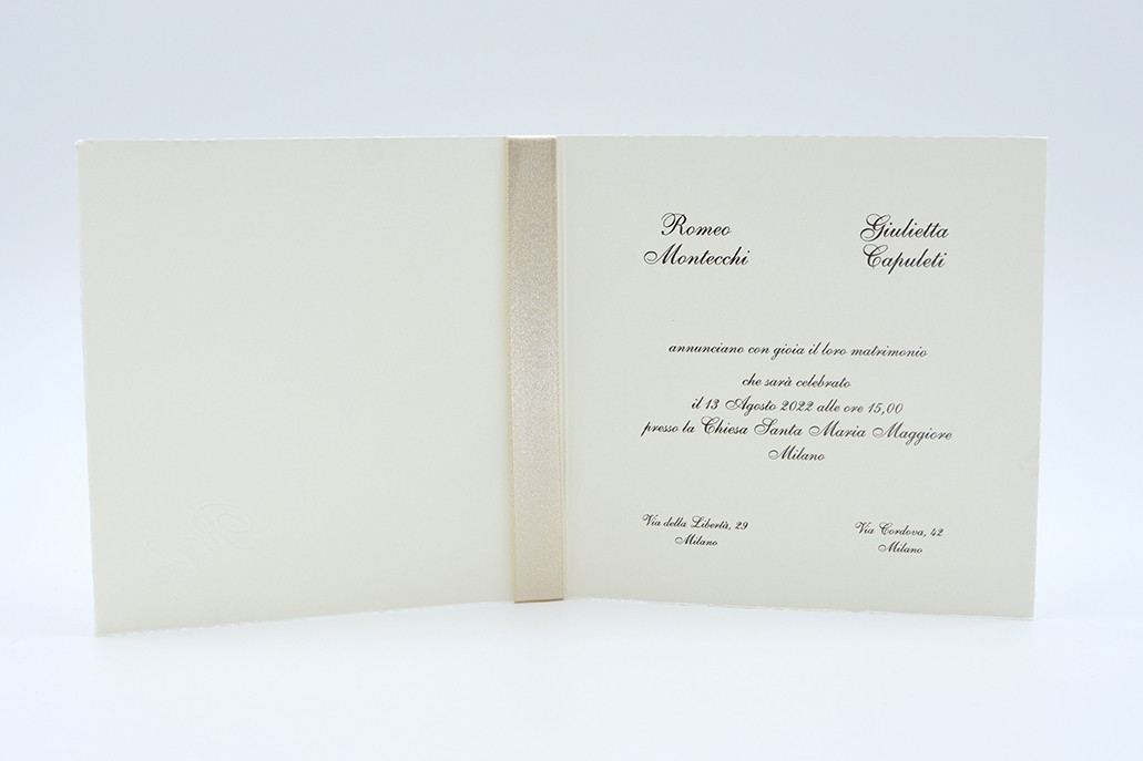 - Formato aperto: 300x150 mm- Formato chiuso: 150x150 mm - Invito formato: 135x85 mm - Carta avorio 300 gr /mq - nastro doppio raso - Busta, invito e biglietto bomboniera inclusi nel prezzo.