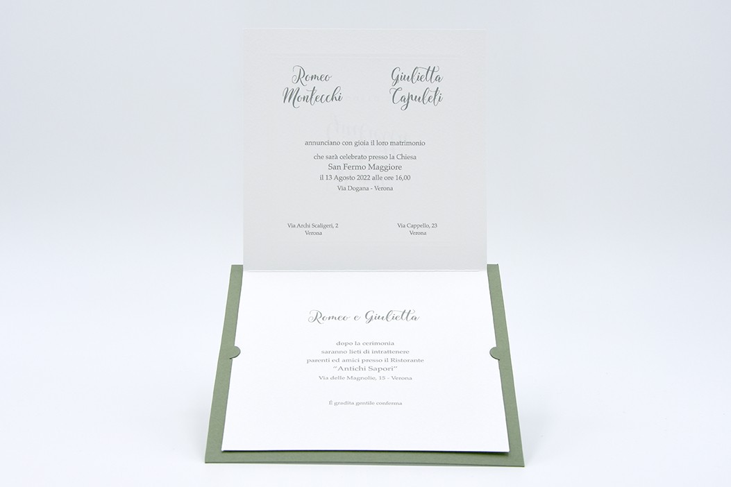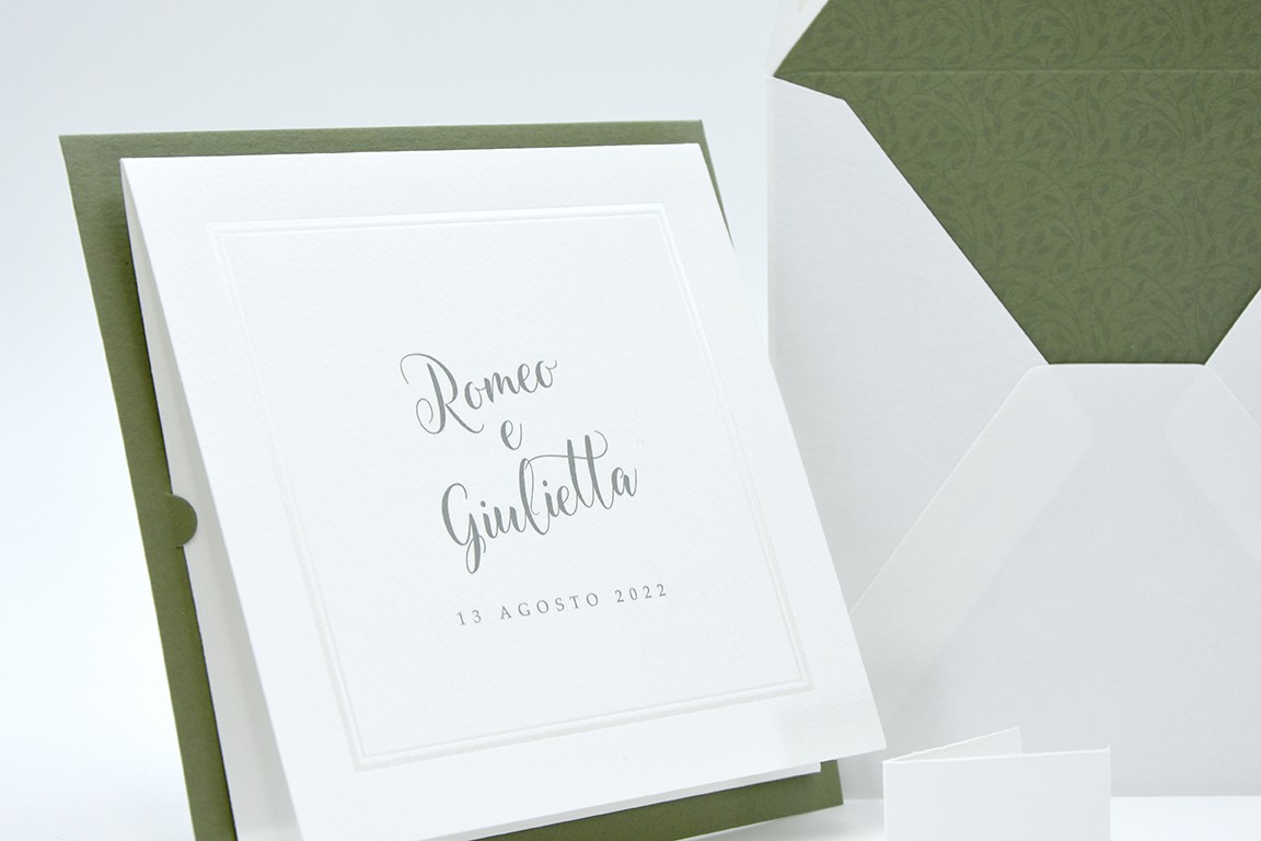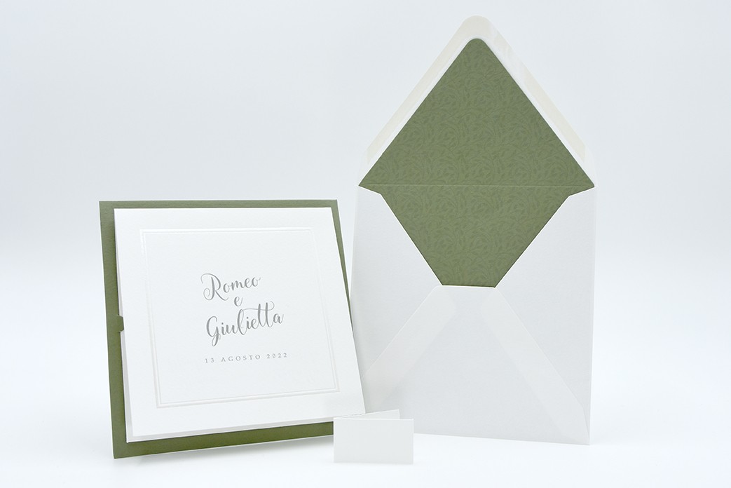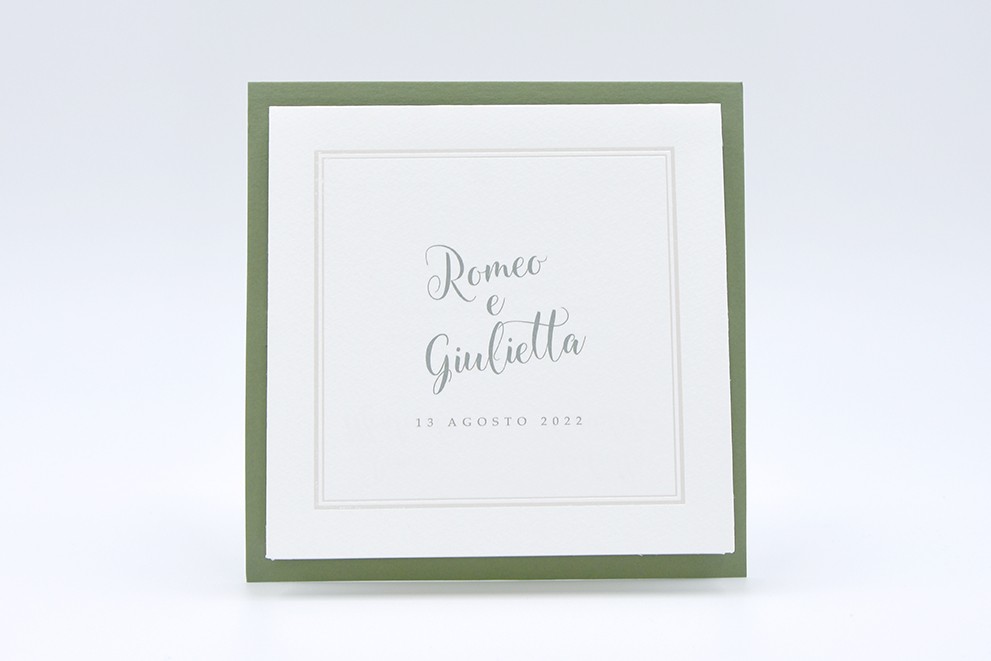 Formato aperto: 300 x 150 mm- Formato chiuso: 150 x 150 mm- Carta bianca 200 gr /mq (interno) - Carta verde 300 gr /mq (esterno) - Lamina a caldo perlata - Busta, interno busta, e biglietto bomboniera inclusi nel prezzo.
