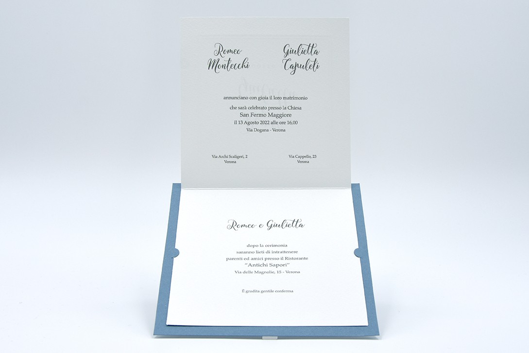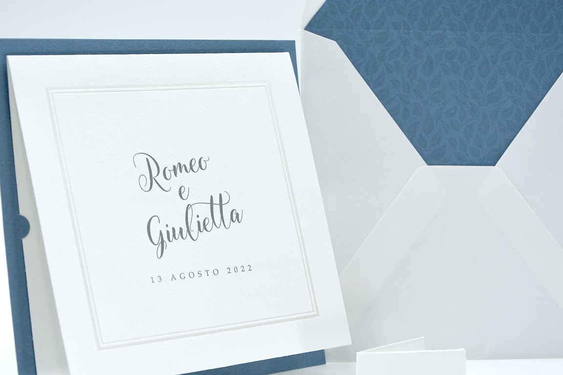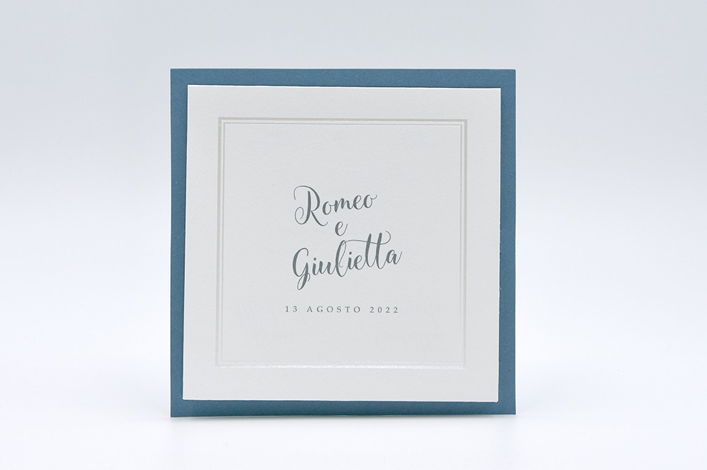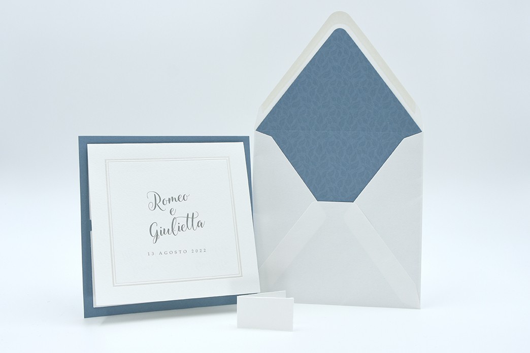 Formato aperto: 300 x 150 mm- Formato chiuso: 150 x 150 mm- Carta bianca 200 gr /mq (interno) - Carta azzurra 300 gr /mq (esterno) - Lamina a caldo perlata - Busta, interno busta, e biglietto bomboniera inclusi nel prezzo.