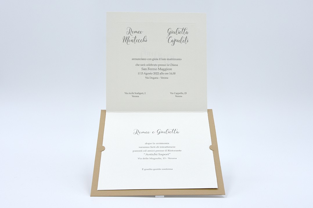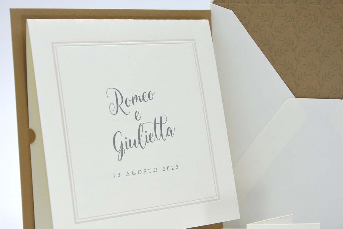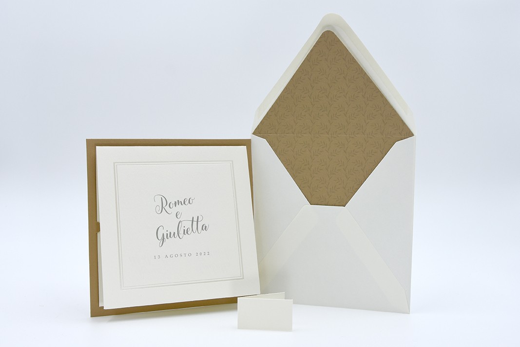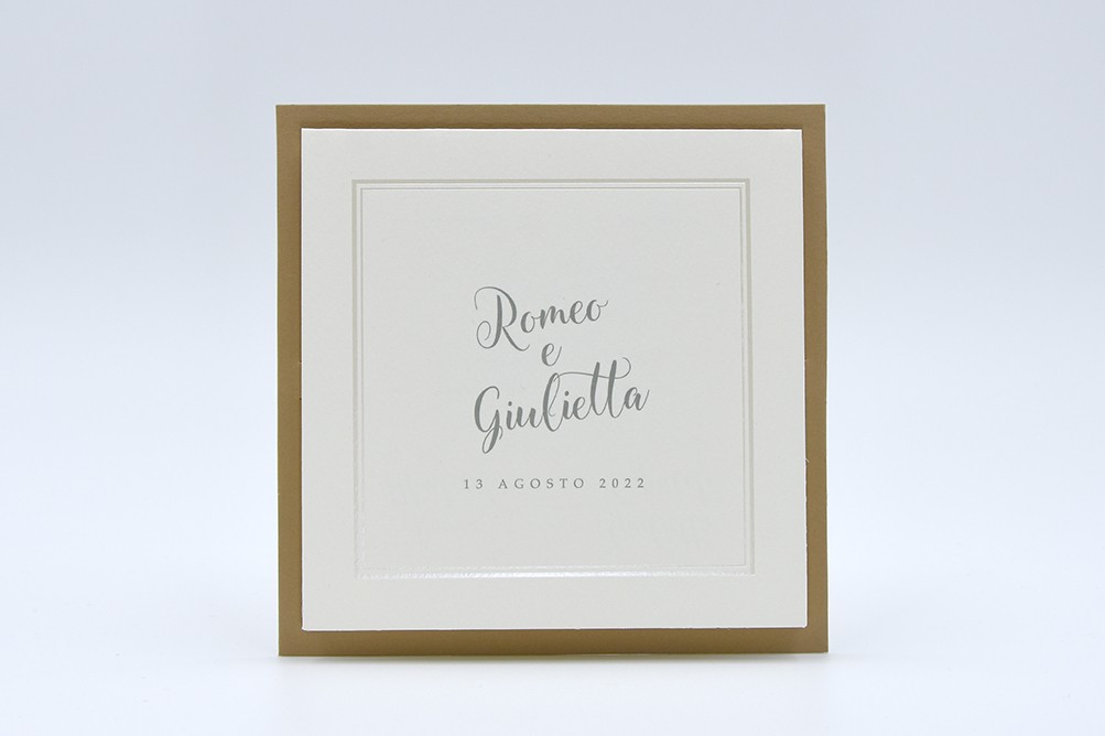 Formato aperto: 300 x 150 mm- Formato chiuso: 150 x 150 mm- Carta bianca 200 gr /mq (interno) - Carta senape 300 gr /mq (esterno) - Lamina a caldo perlata - Busta, interno busta, e biglietto bomboniera inclusi nel prezzo.