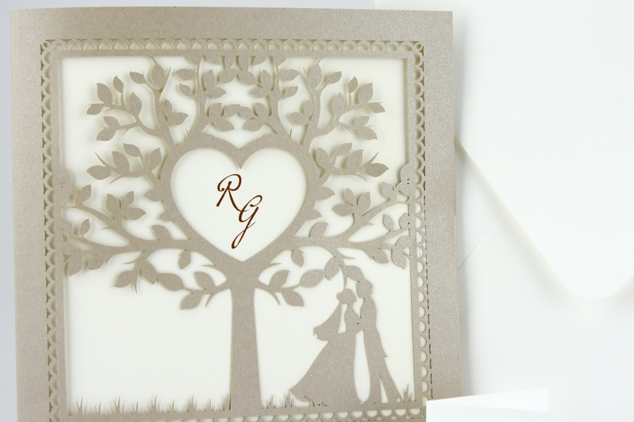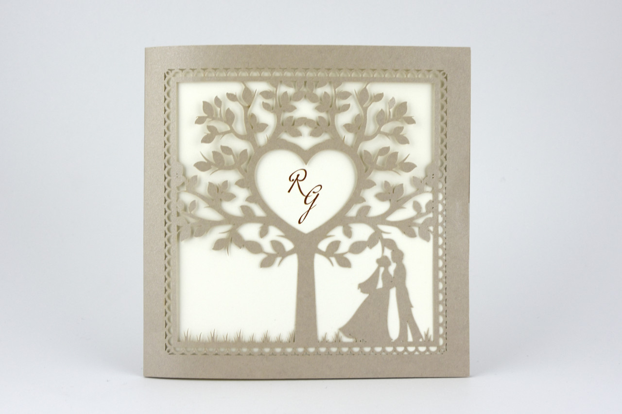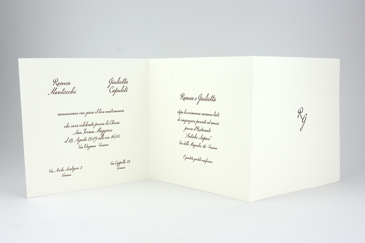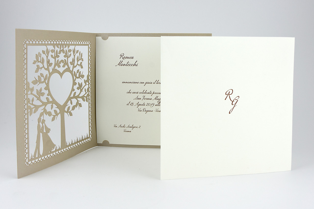 - Formato aperto: 420 x150 mm- Formato chiuso: 150x150 mm- Carta Nocciola Perlata 240 gr /mq (Esterno)- Carta Avorio 170 gr /mq (Interno)- Lavorazione con taglio a laser- Busta, invito e biglietto bomboniera inclusi nel prezzo