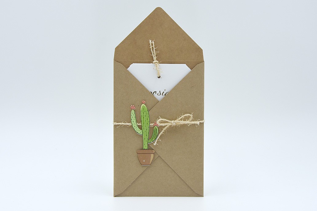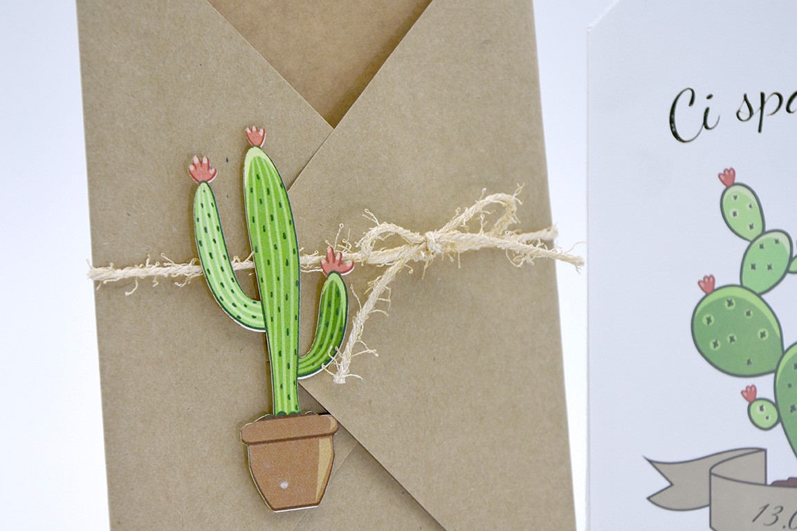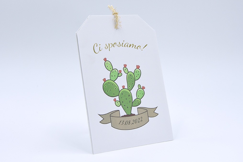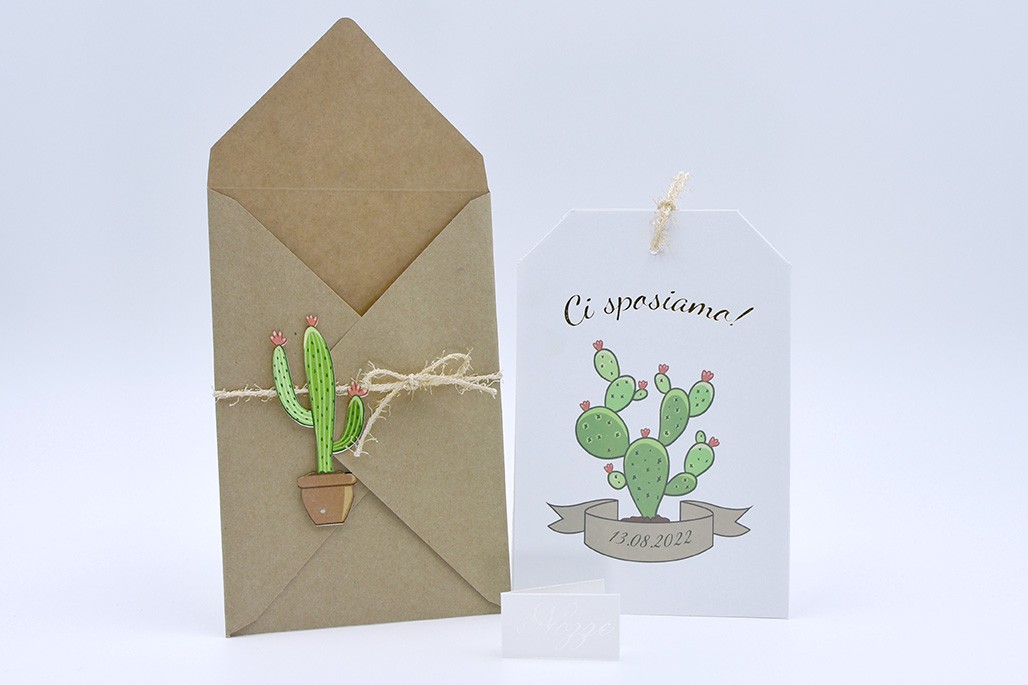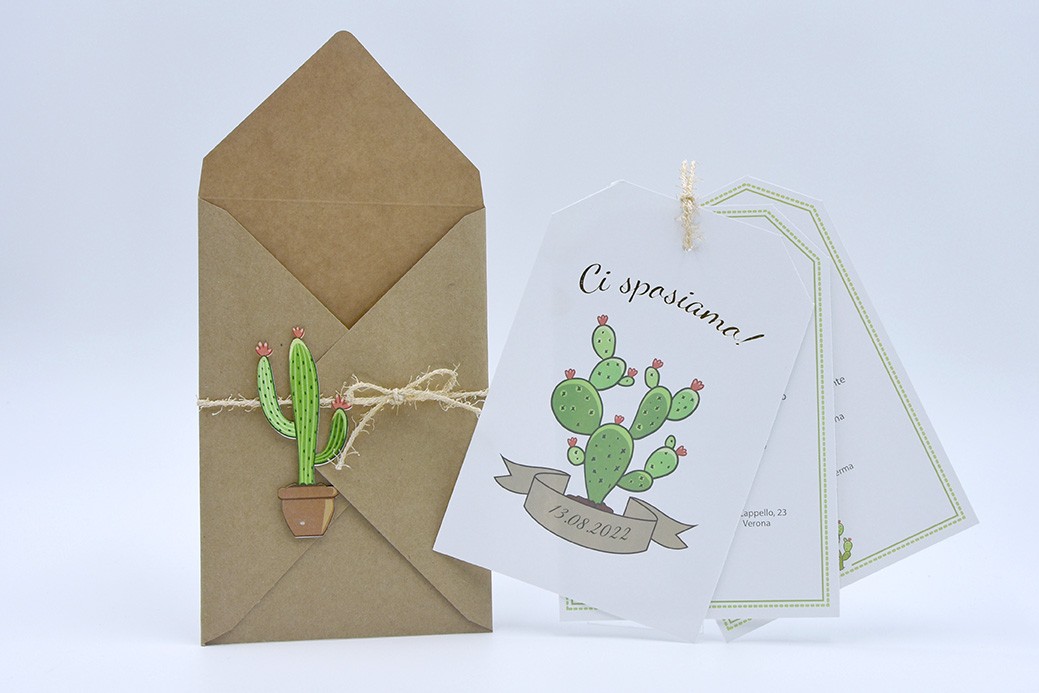 Formato aperto: 115 x 170 mm - Formato chiuso: 115 x 170 mm - Carta 200 gr /mq (interno) - Carta 200 gr /mq (Busta marrone) - Lamina a caldo oro - Busta, nastro, invito e biglietto bomboniera inclusi nel prezzo.