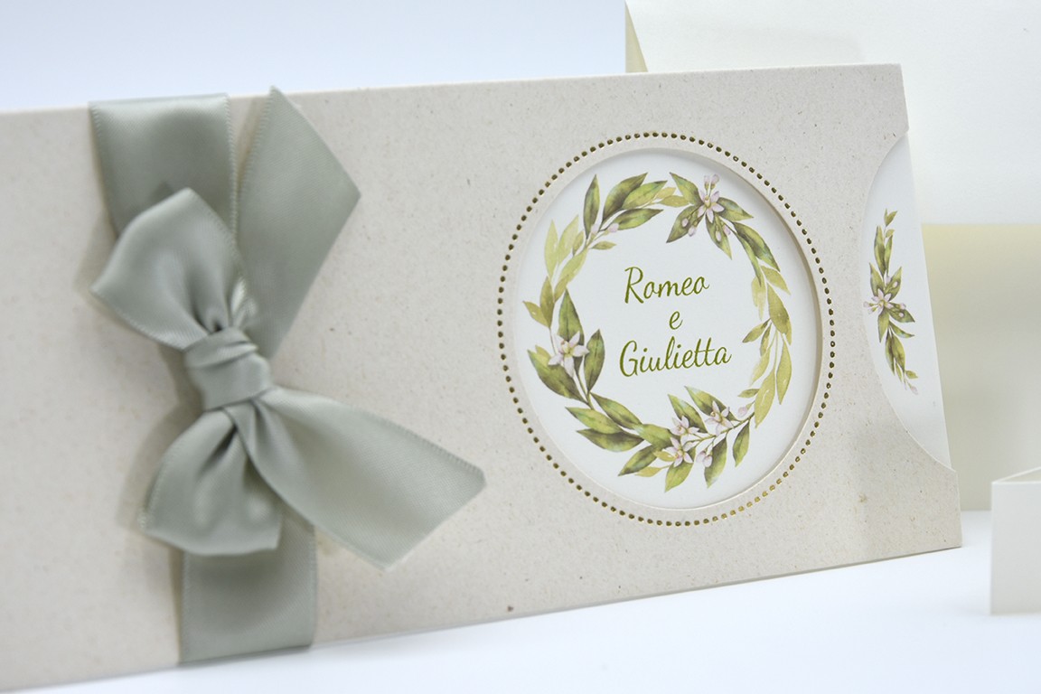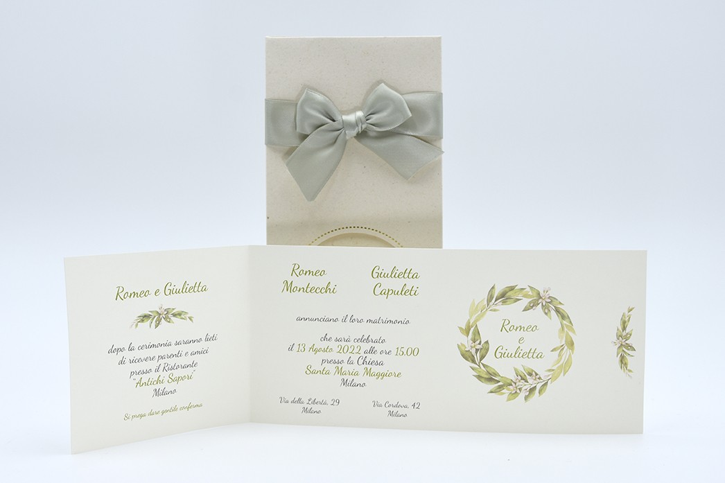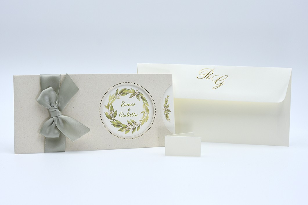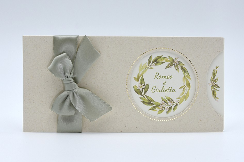 Formato aperto: 310 x 100 mm- Formato chiuso: 210 x 100 mm - Carta riciclata avorio 200 gr /mq (interno) - Carta riciclata beige 240 gr /mq (esterno) - Lamina a caldo oro - Nastro doppio raso mm 25 - Busta, nastro, invito e biglietto bomboniera inclusi nel prezzo.