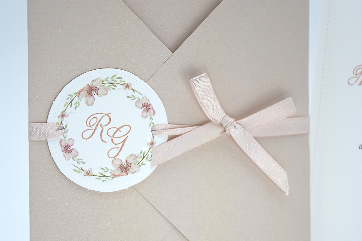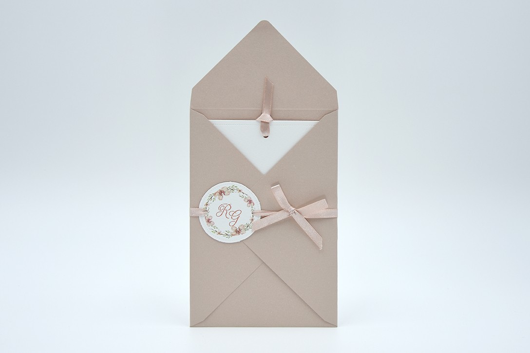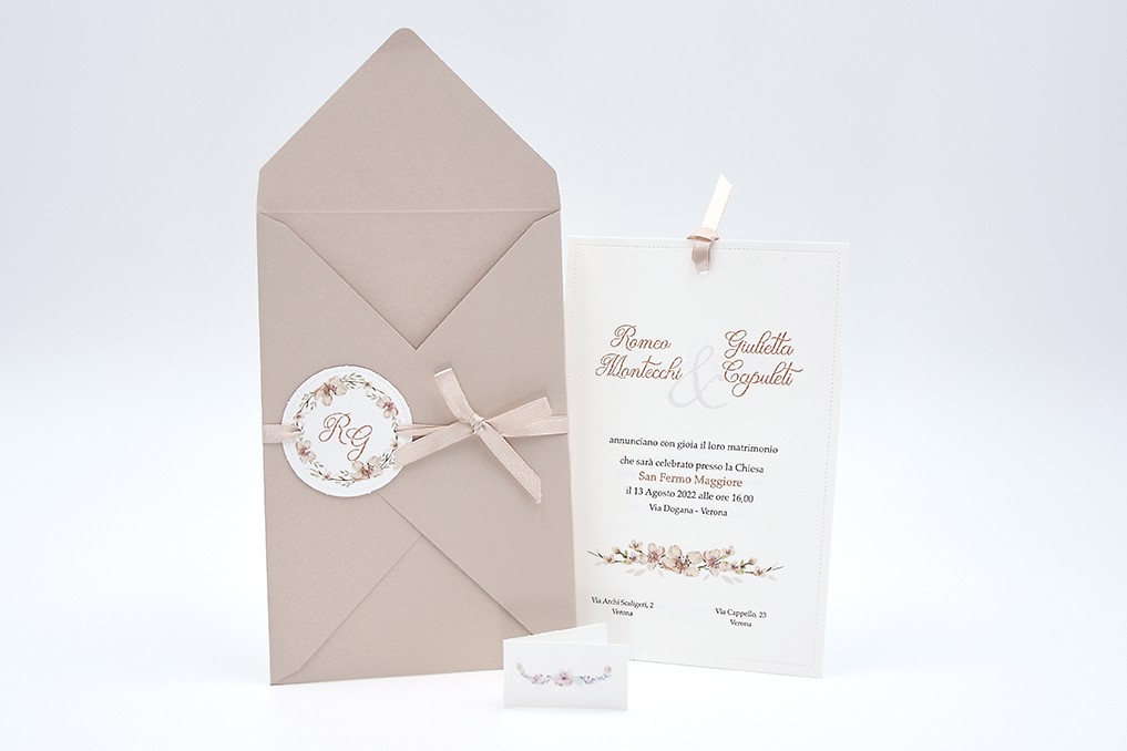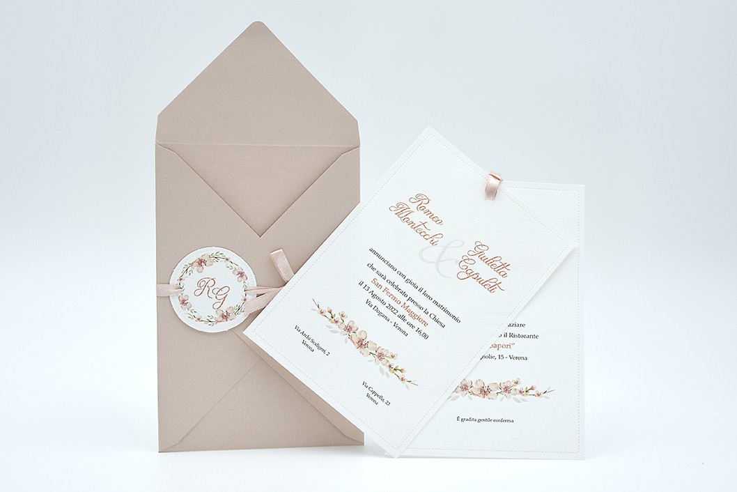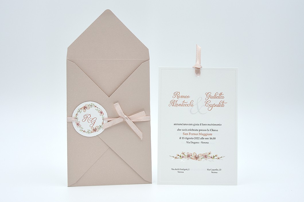 Formato aperto: 115 x 170 mm - Formato chiuso: 115 x 170 mm - Carta bianca 200 gr /mq (interno) - Carta cipria 200 gr /mq (busta) - Lamina a caldo perlata - nastro doppio raso mm 6 - Busta, nastro, invito e biglietto bomboniera inclusi nel prezzo.