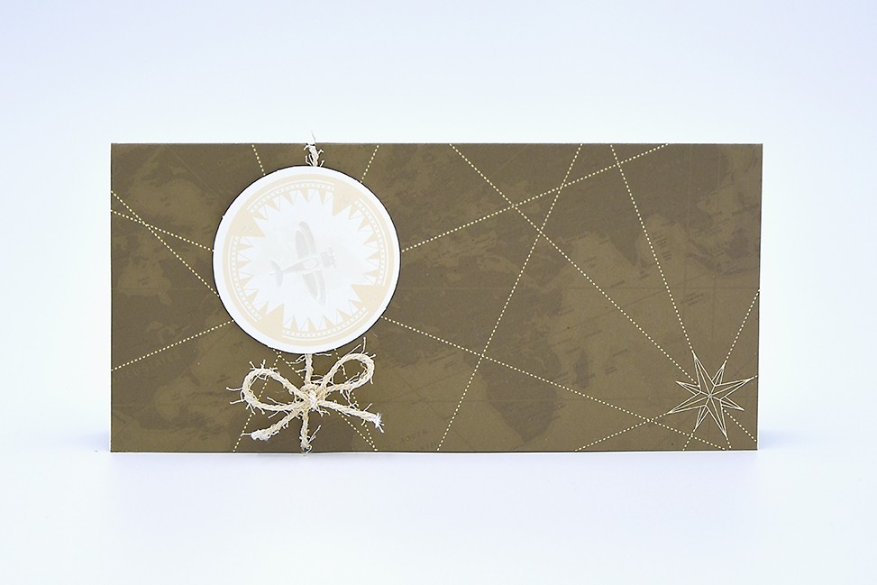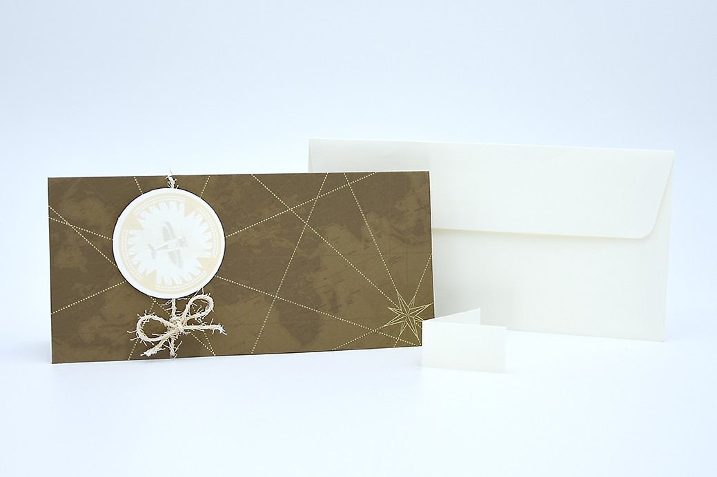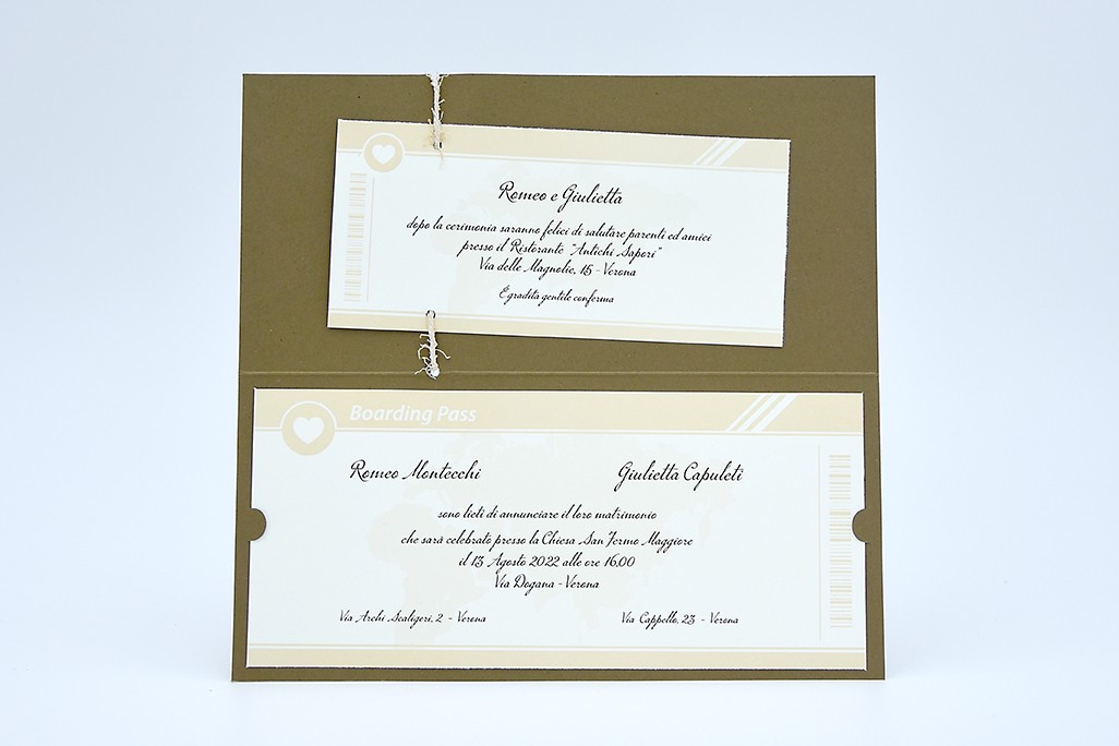 Formato aperto: 210 x 200 mm- Formato chiuso: 210 x 100 mm - Carta avorio 200 gr /mq (interno) - Carta marrone 240 gr /mq (esterno) - Lamina oro e perlato - Busta, nastro e biglietto bomboniera inclusi nel prezzo. Tag inclusi in tre varianti.