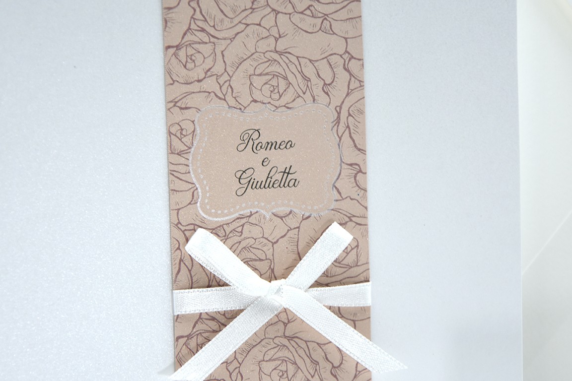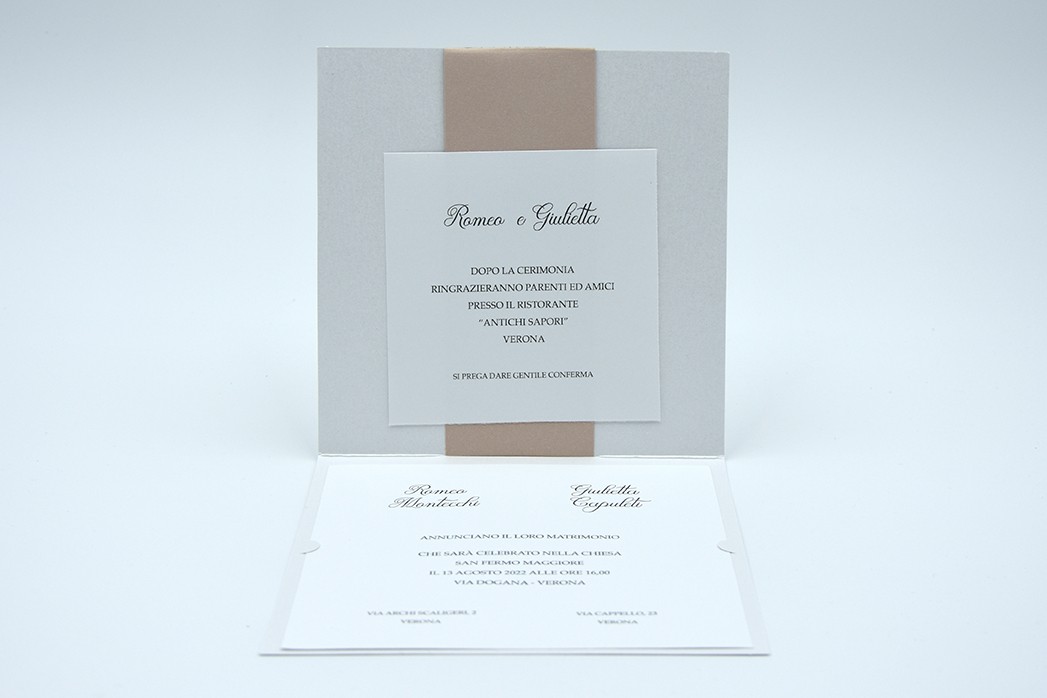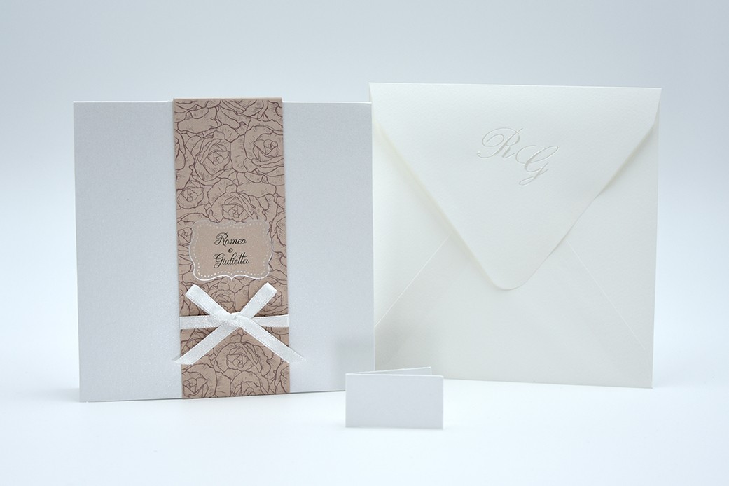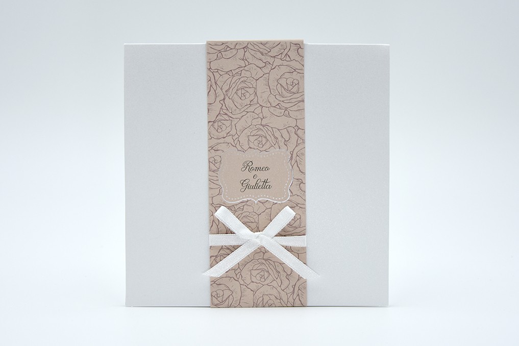 Formato aperto: 300 x150 mm - Formato chiuso: 150 x150 mm - Carta bianca perlata 3240 gr /mq (Esterno) - Carta bianca 200gr /mq (Interno) - Fascetta in carta rosa perlata con lamina a caldo perlata - Nastro doppio raso mm 6 - Busta, invito e biglietto bomboniera inclusi nel prezzo.
