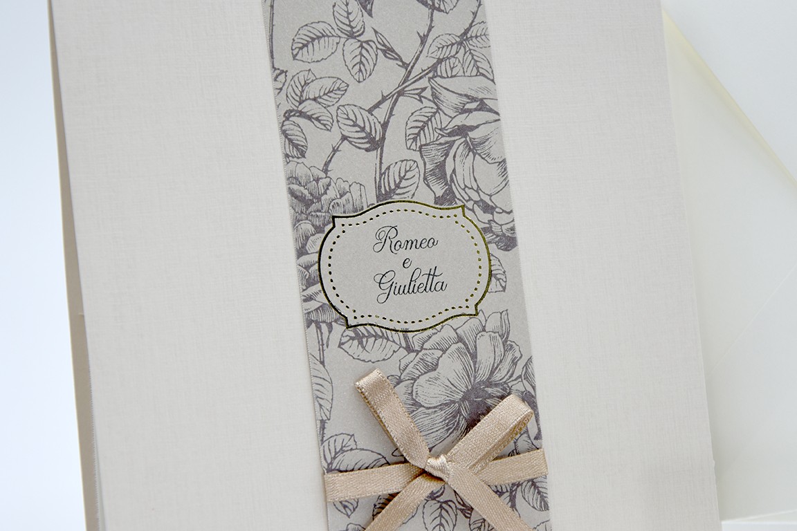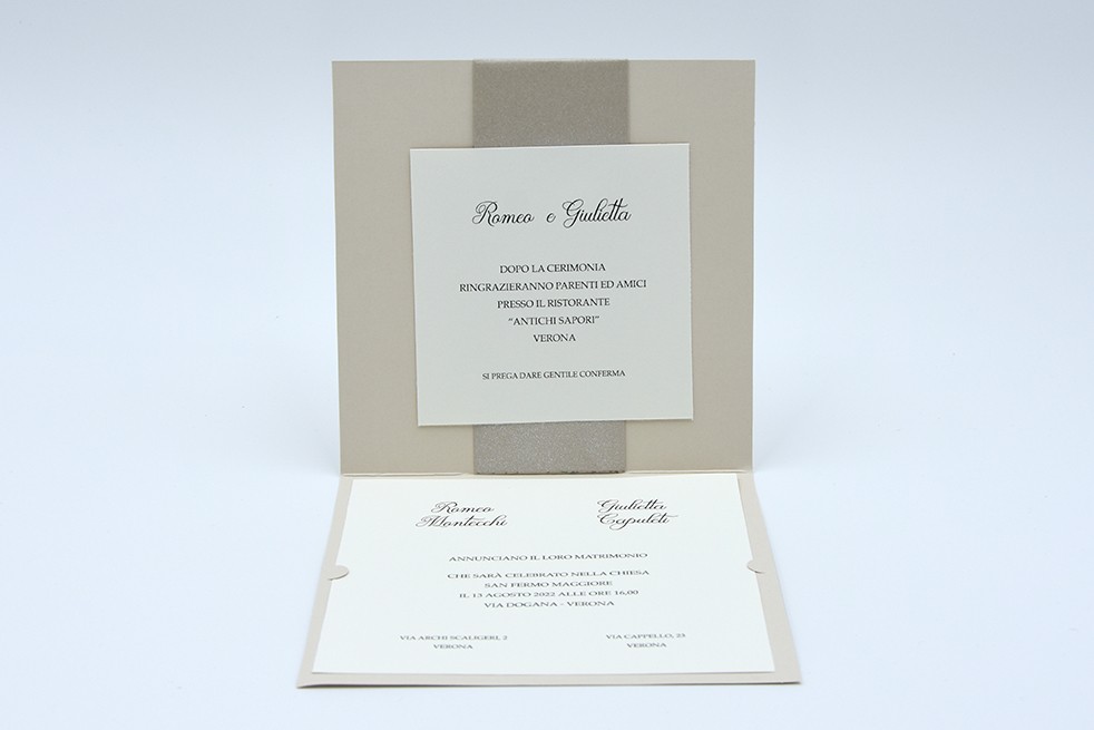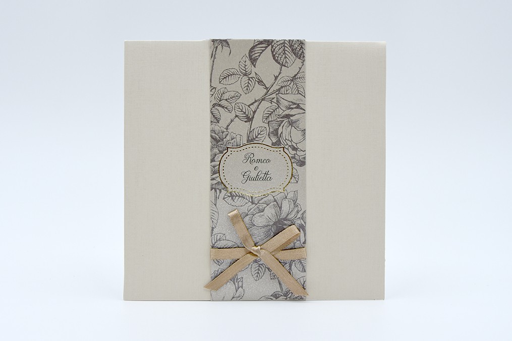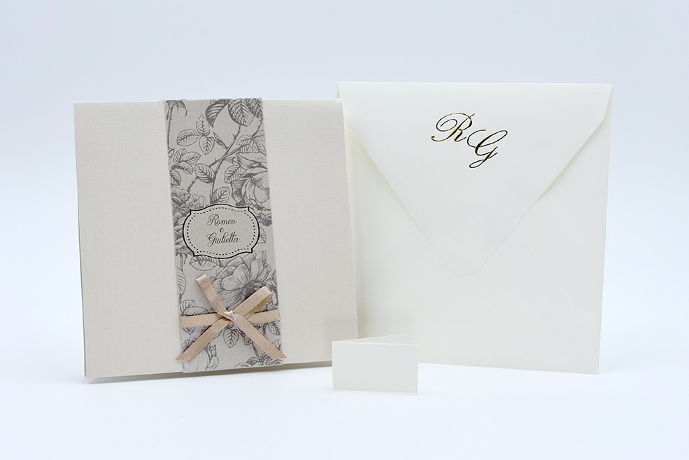 Formato aperto: 300 x150 mm - Formato chiuso: 150 x150 mm - Carta avorio perlata 240 gr /mq (Esterno) - Carta avorio 200 gr /mq (Interno) - Fascetta in carta perlata nocciola con lamina a caldo oro - Nastro doppio raso mm 6 - Busta, invito e biglietto bomboniera inclusi nel prezzo.
