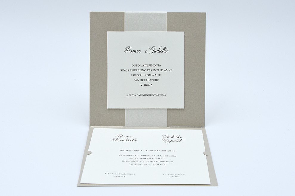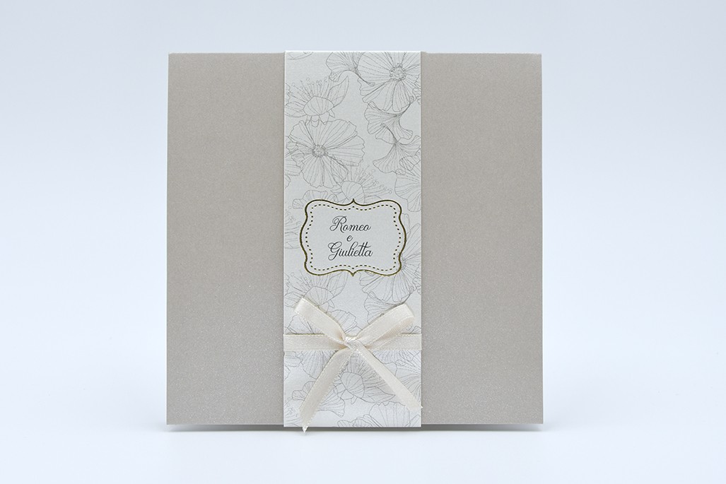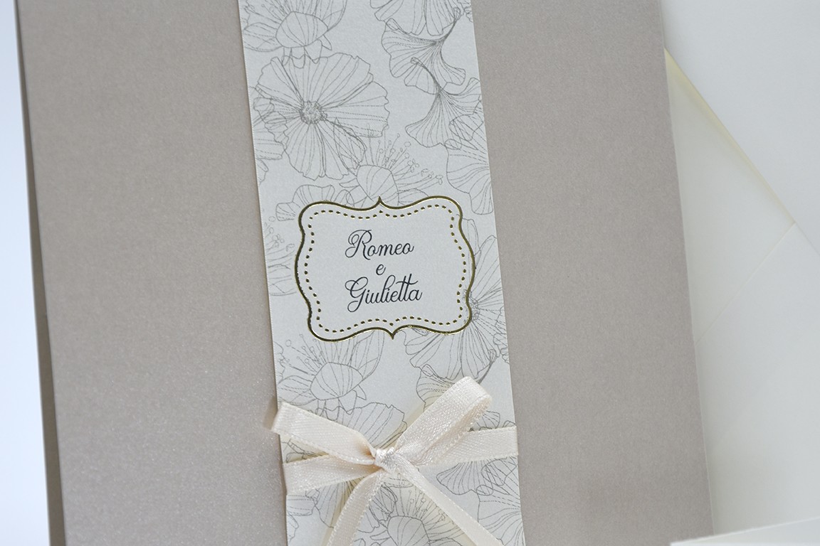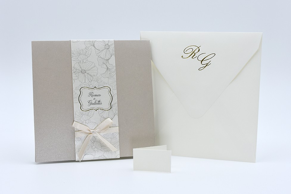 Formato aperto: 300 x150 mm - Formato chiuso: 150 x150 mm - Carta nocciola perlata 240 gr /mq (Esterno) - Carta avorio 200 gr /mq (Interno) - Fascetta in carta avorio perlata con lamina a caldo oro - Nastro doppio raso mm 6 - Busta, invito e biglietto bomboniera inclusi nel prezzo.
