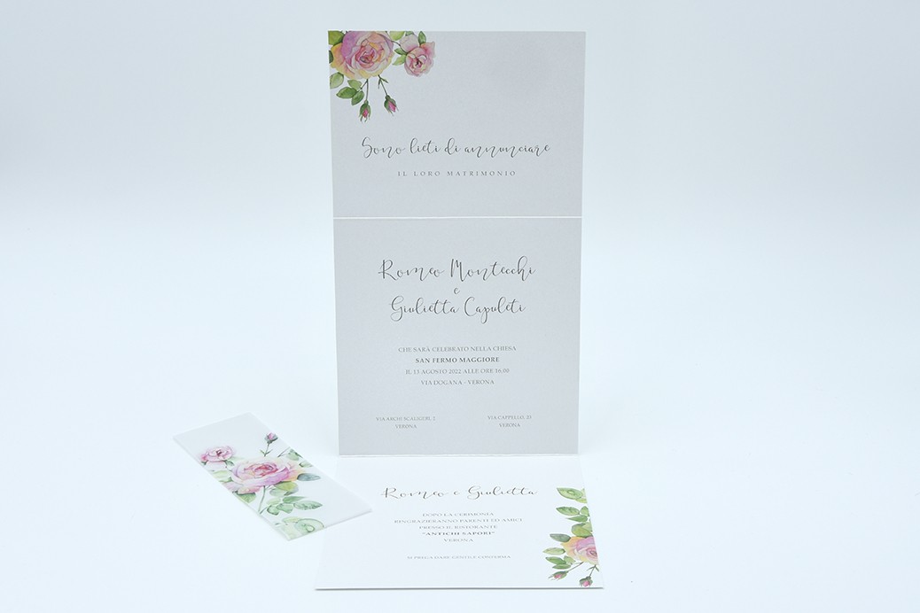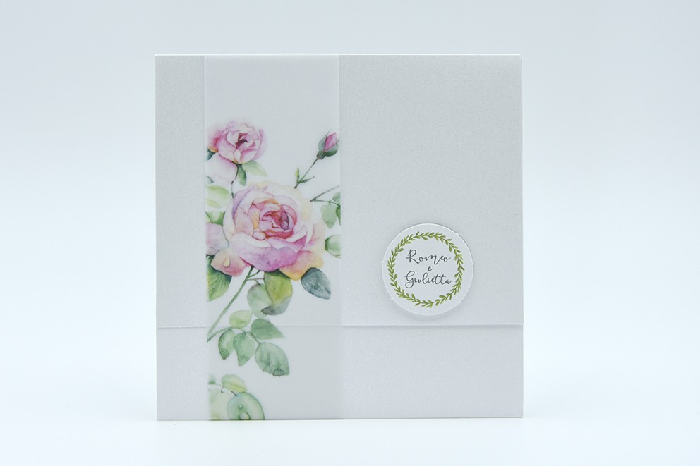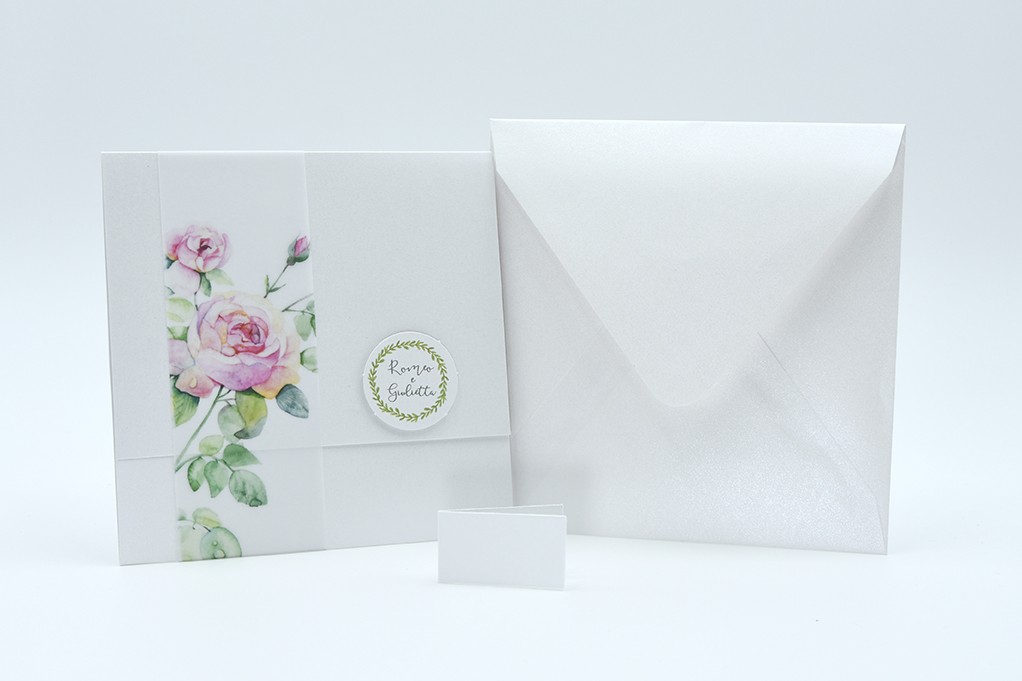 Formato aperto: 300 x 150 mm- Formato chiuso: 150 x 150 mm- Carta bianca perlata 240 gr /mq (esterno) - Fascetta in carta semitrasparente opaca - Busta, tag e biglietto bomboniera inclusi nel prezzo.