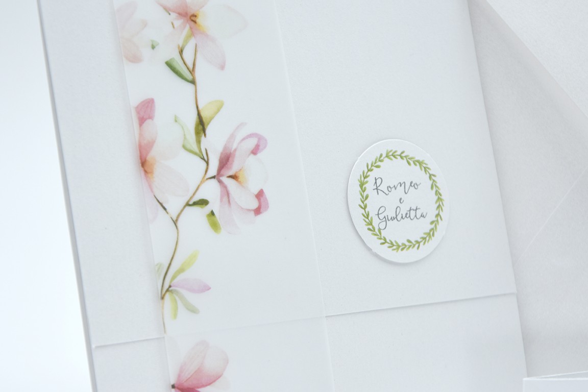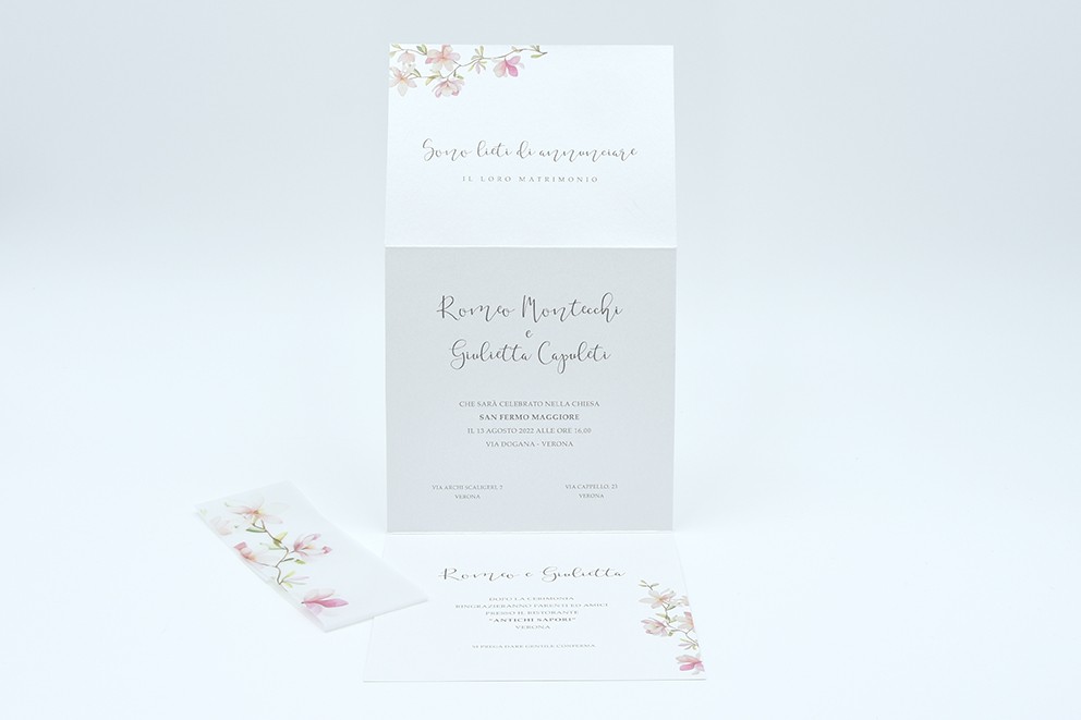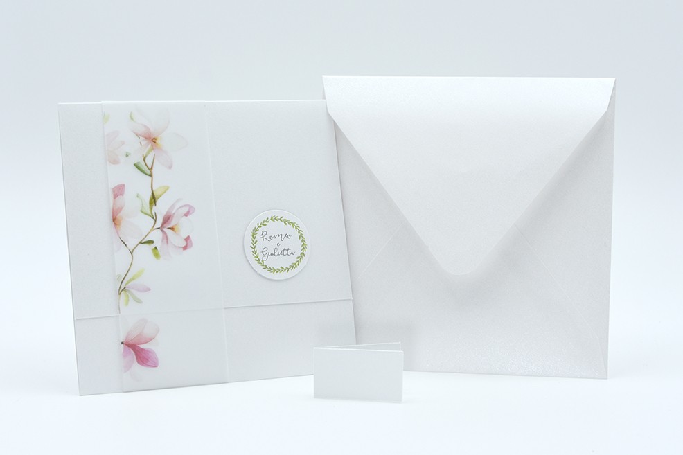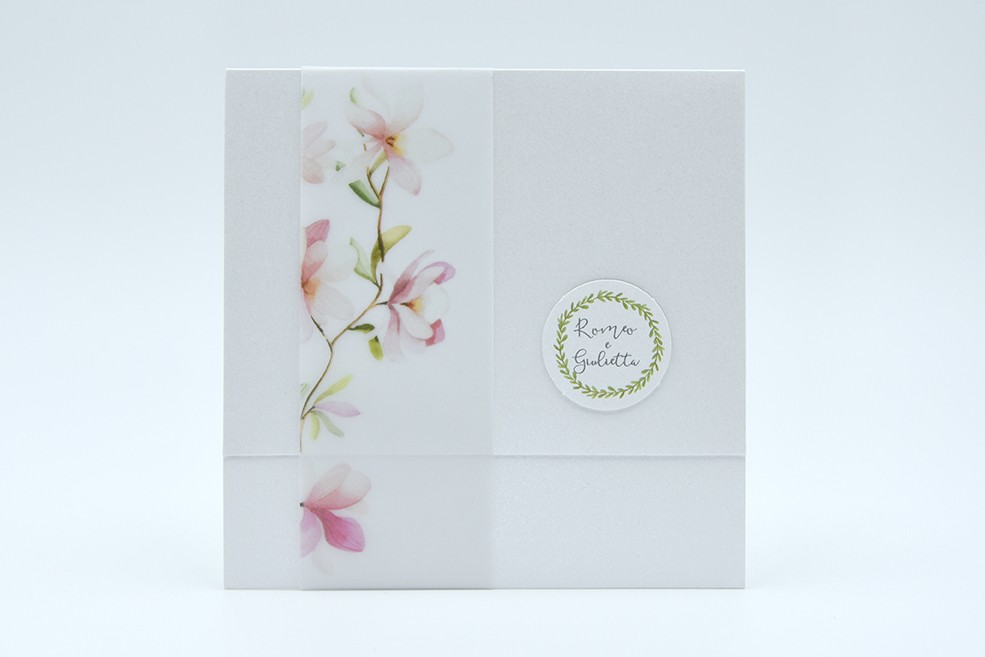 Formato aperto: 300 x 150 mm- Formato chiuso: 150 x 150 mm- Carta bianca perlata 240 gr /mq (esterno) - Fascetta in carta semitrasparente opaca - Busta, tag e biglietto bomboniera inclusi nel prezzo.