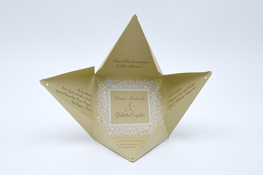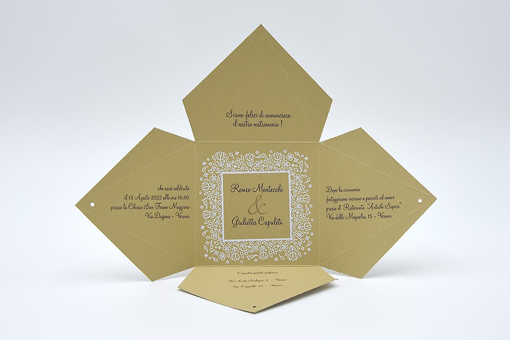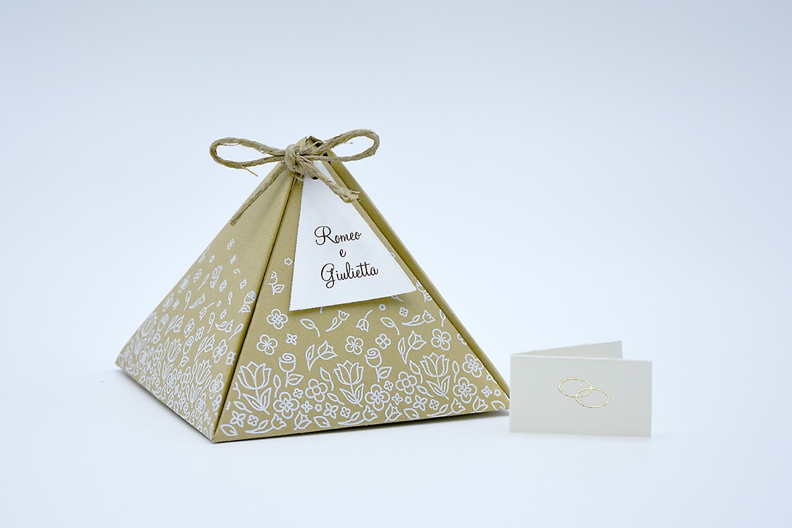 Formato aperto: 216x216 mm - Formato chiuso: 80 x 80 x 70 mm - Carta bianca 200 gr /mq (tag) - Carta senape 300 gr /mq (esterno) - Lamina a caldo bianca - Nastro - Busta, tag, nastro e biglietto bomboniera inclusi nel prezzo.