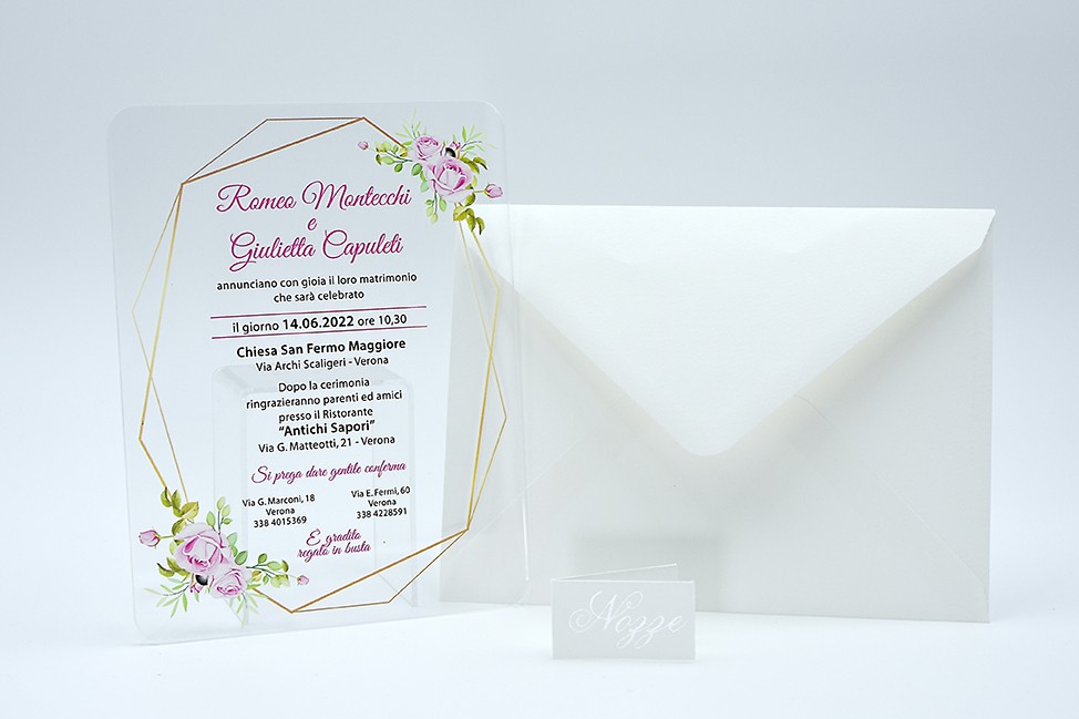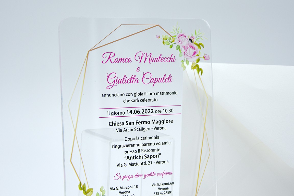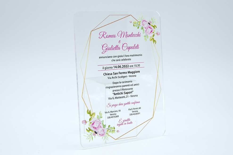 Formato aperto: 130x 180 mm - Stampa UV su plexiglass trasparente da 3 mm - Stampa, busta e biglietto bomboniera inclusi nel prezzo.