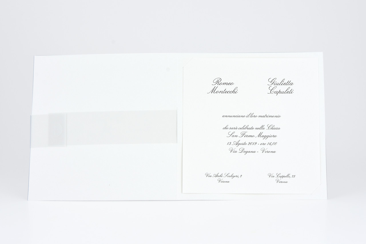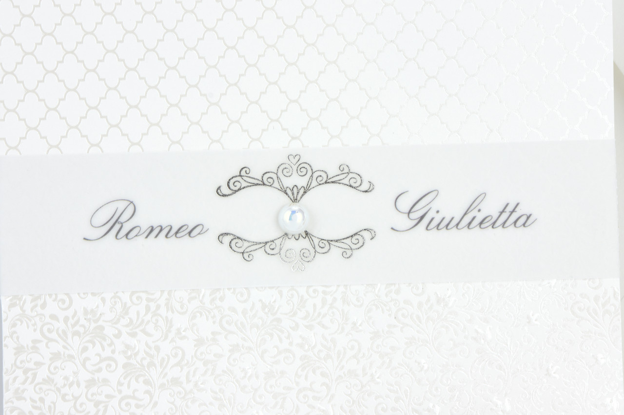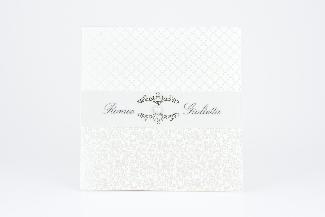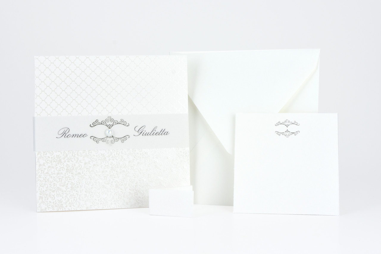 - Formato aperto: 300x150 mm- Formato chiuso: 150x150 mm- Carta Bianca 240 gr /mq (Esterno)- Carta Bianca 170 gr /mq (Interno)- Lamina a caldo perlata e rilievo- Fascetta in carta semitrasparente satinata con lamina a caldo argento e perla con applicazione adesiva- Busta, invito e biglietto bomboniera inclusi nel prezzo