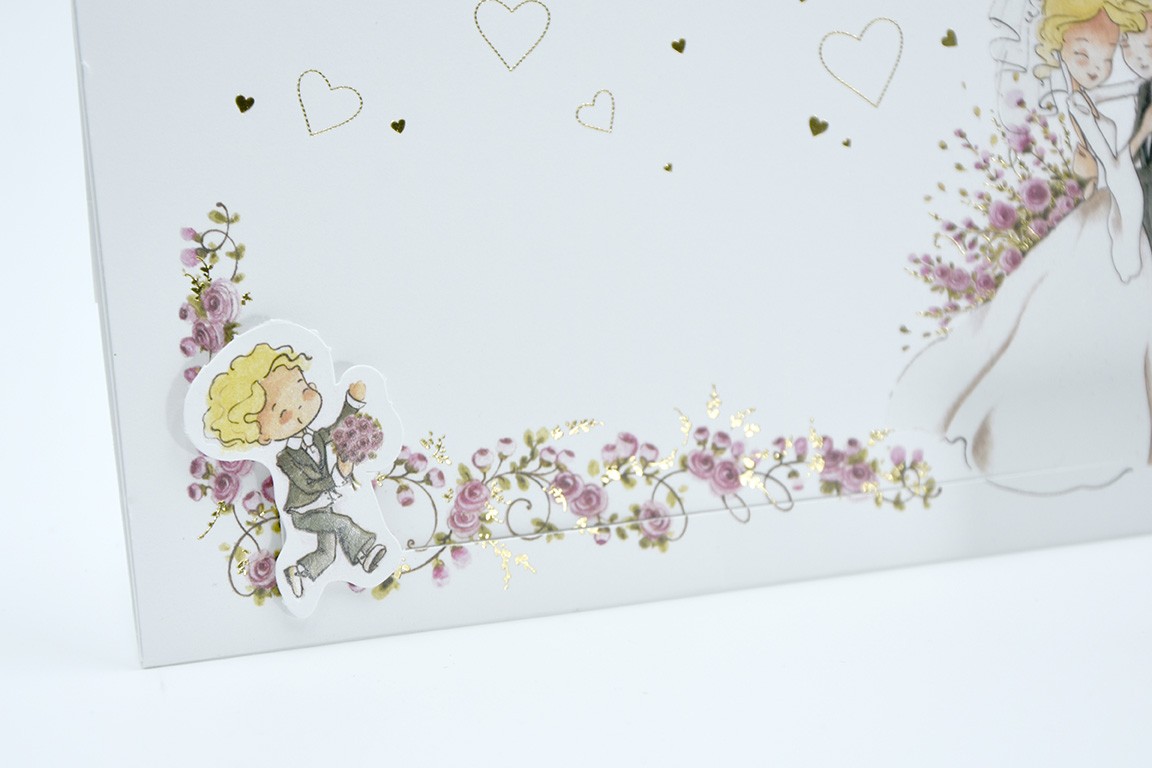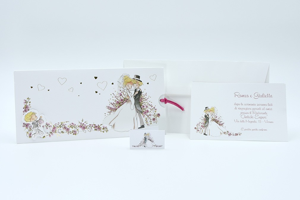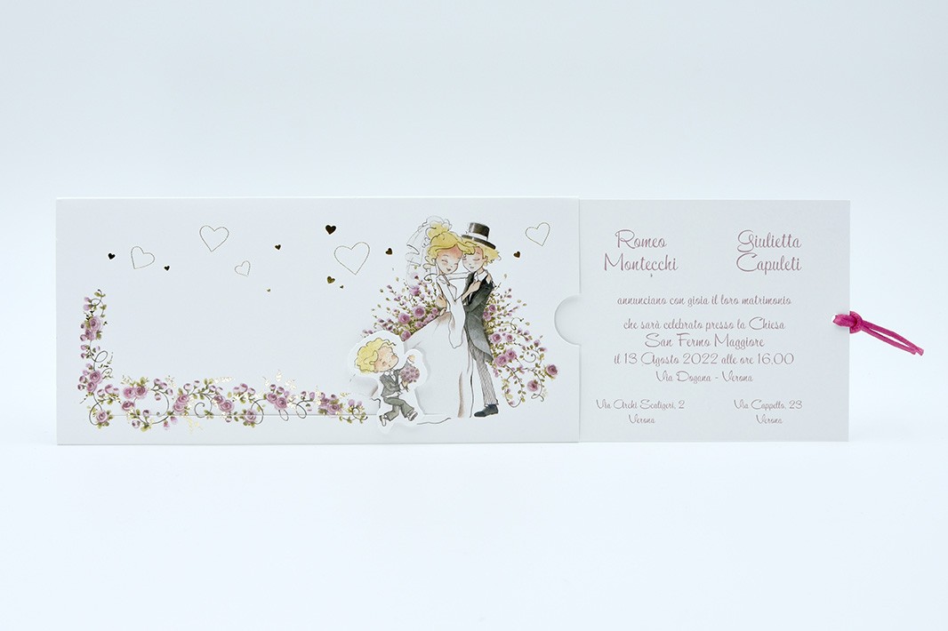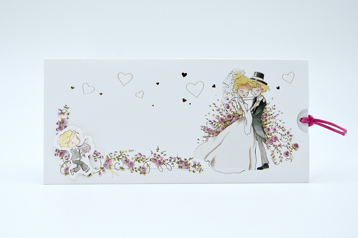 Formato aperto: 310 x 100 mm- Formato chiuso: 210 x 100 mm- Carta bianca 200 gr /mq (interno) - Carta bianca 200 gr /mq (esterno) - Lamina a caldo oro - Busta, nastro, invito e biglietto bomboniera inclusi nel prezzo.