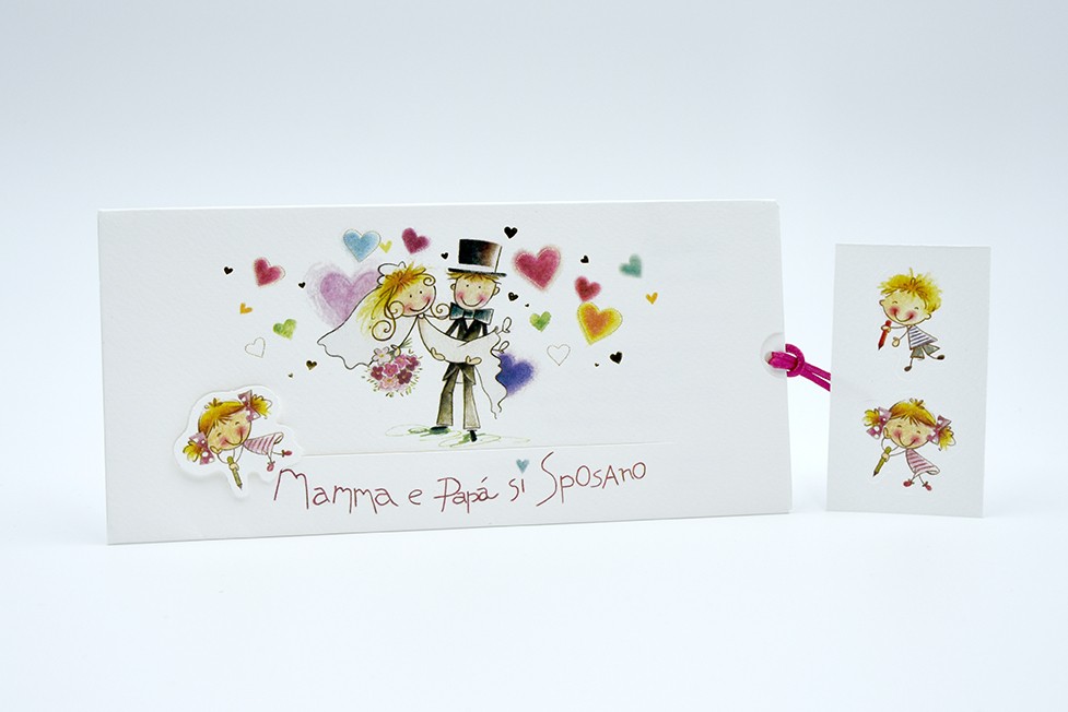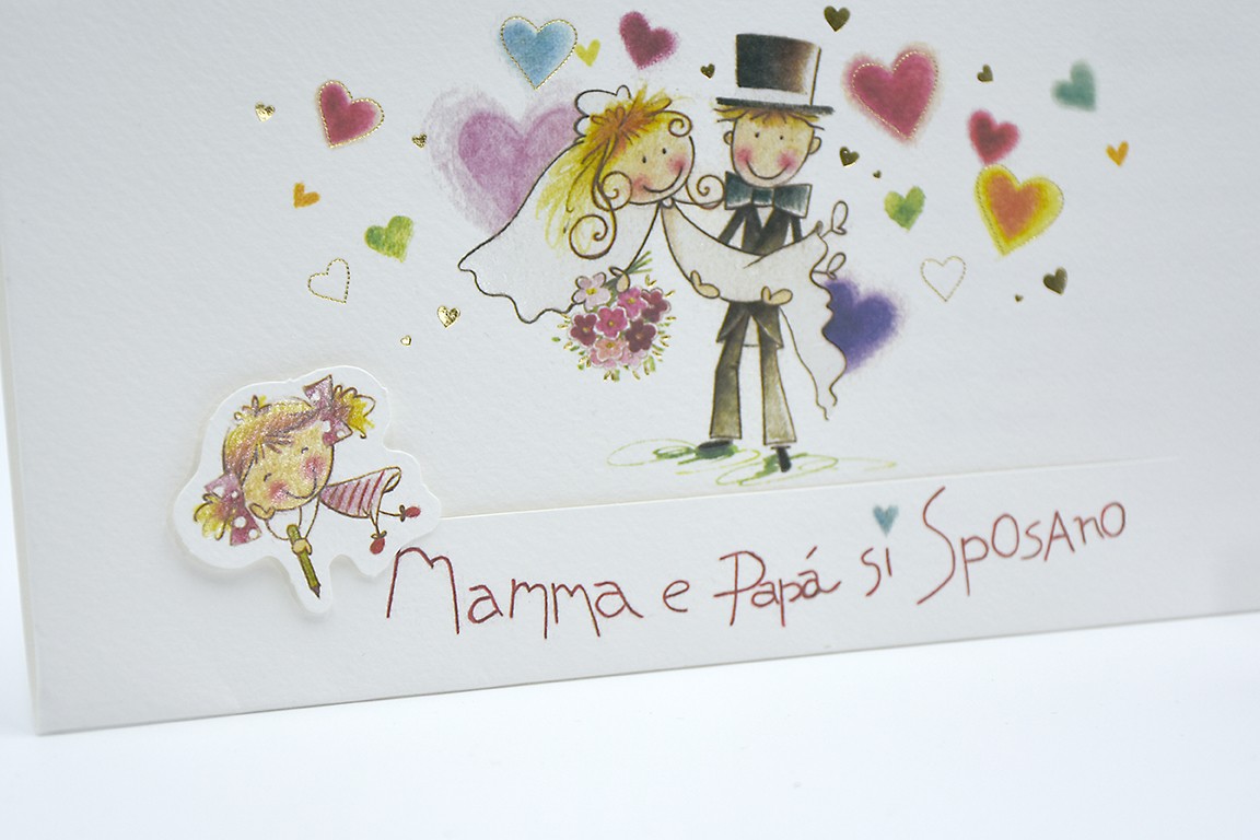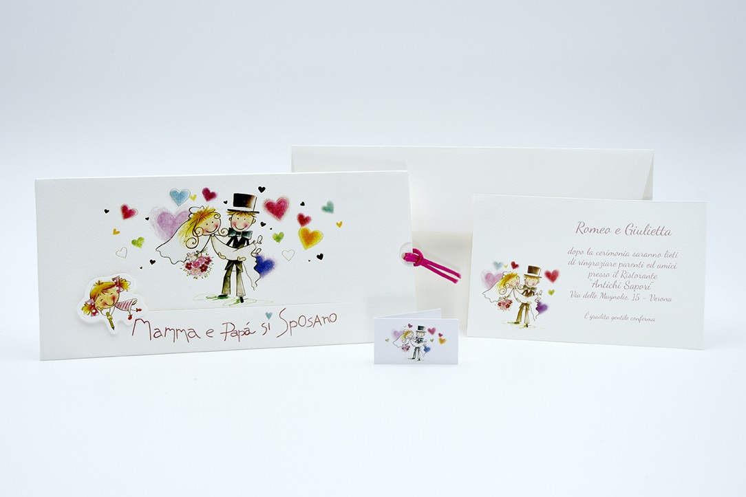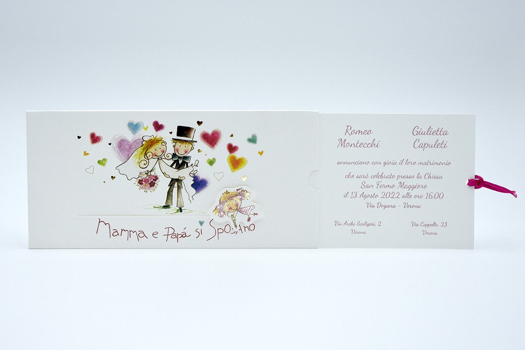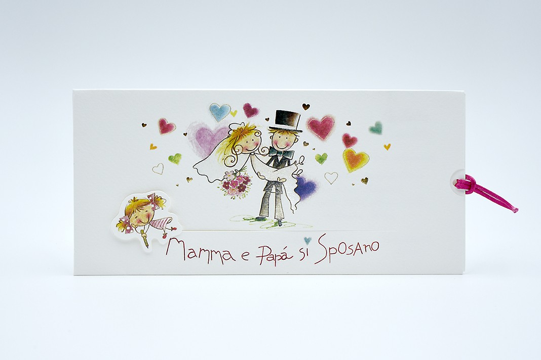 Formato aperto: 310 x 100 mm- Formato chiuso: 210 x 100 mm- Carta bianca 200 gr /mq (interno) - Carta bianca 200 gr /mq (esterno) - Lamina a caldo oro - Busta, nastro, invito e biglietto bomboniera inclusi nel prezzo.